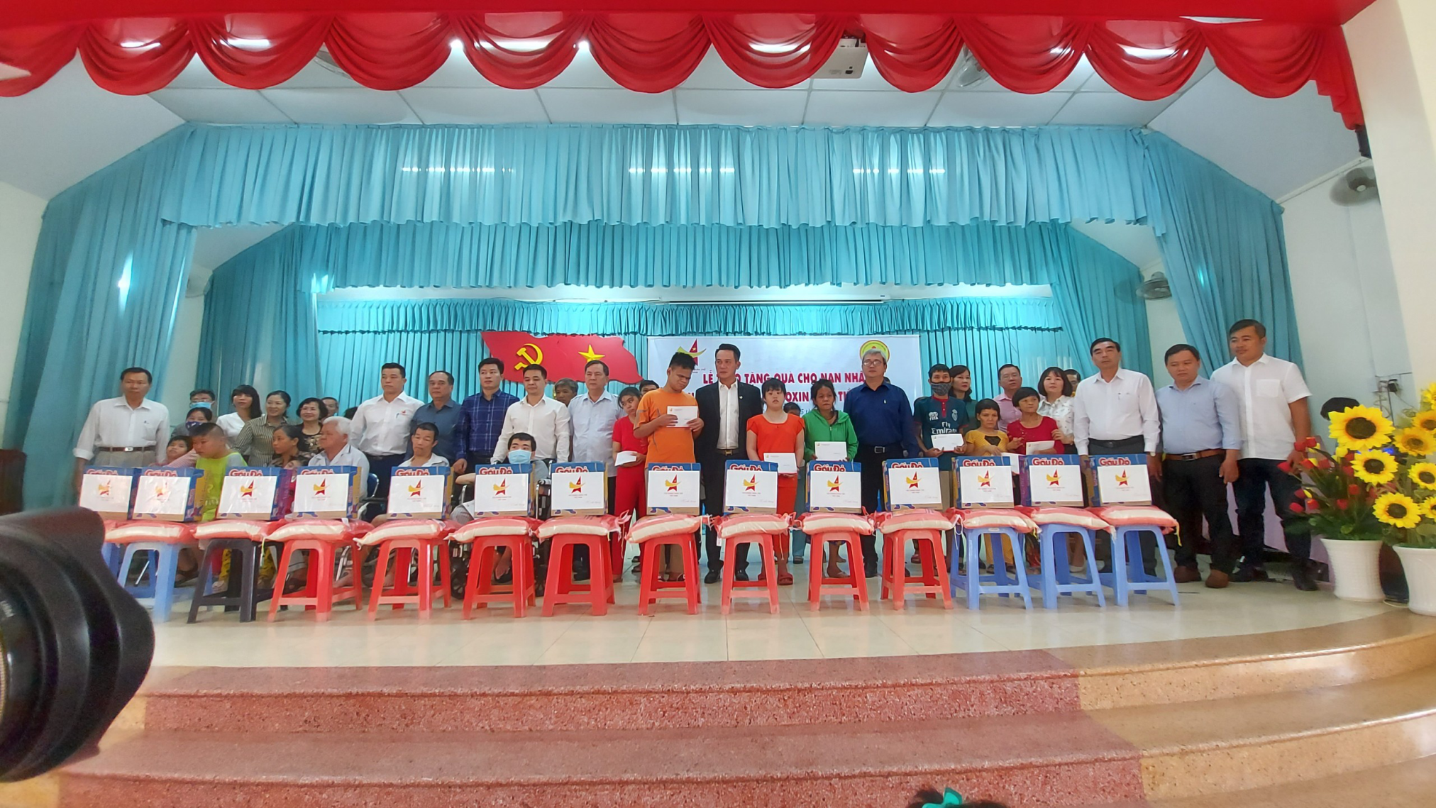 Đại biểu lãnh đạo Hội NNCĐDC/dioxin Việt Nam và Hội Doanh nhân trẻ Việt Nam tặng quà tại Tiền Giang