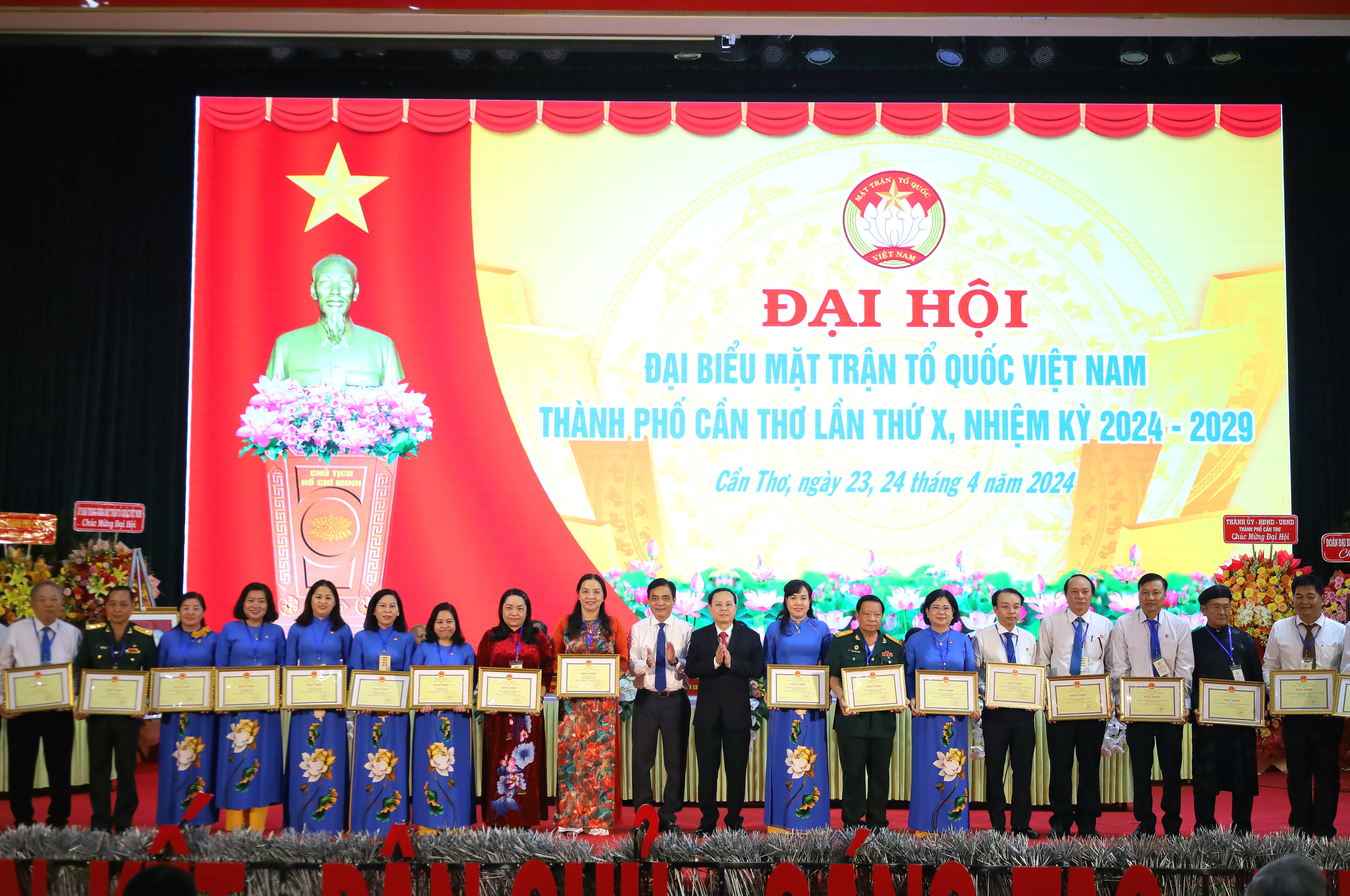 Bà Võ Thị Thanh Nga (thứ 6, từ phải qua), Chủ tịch Thành hội nhận bằng khen tại Đại hội Đại biểu MTTQVN TP.Cần Thơ
