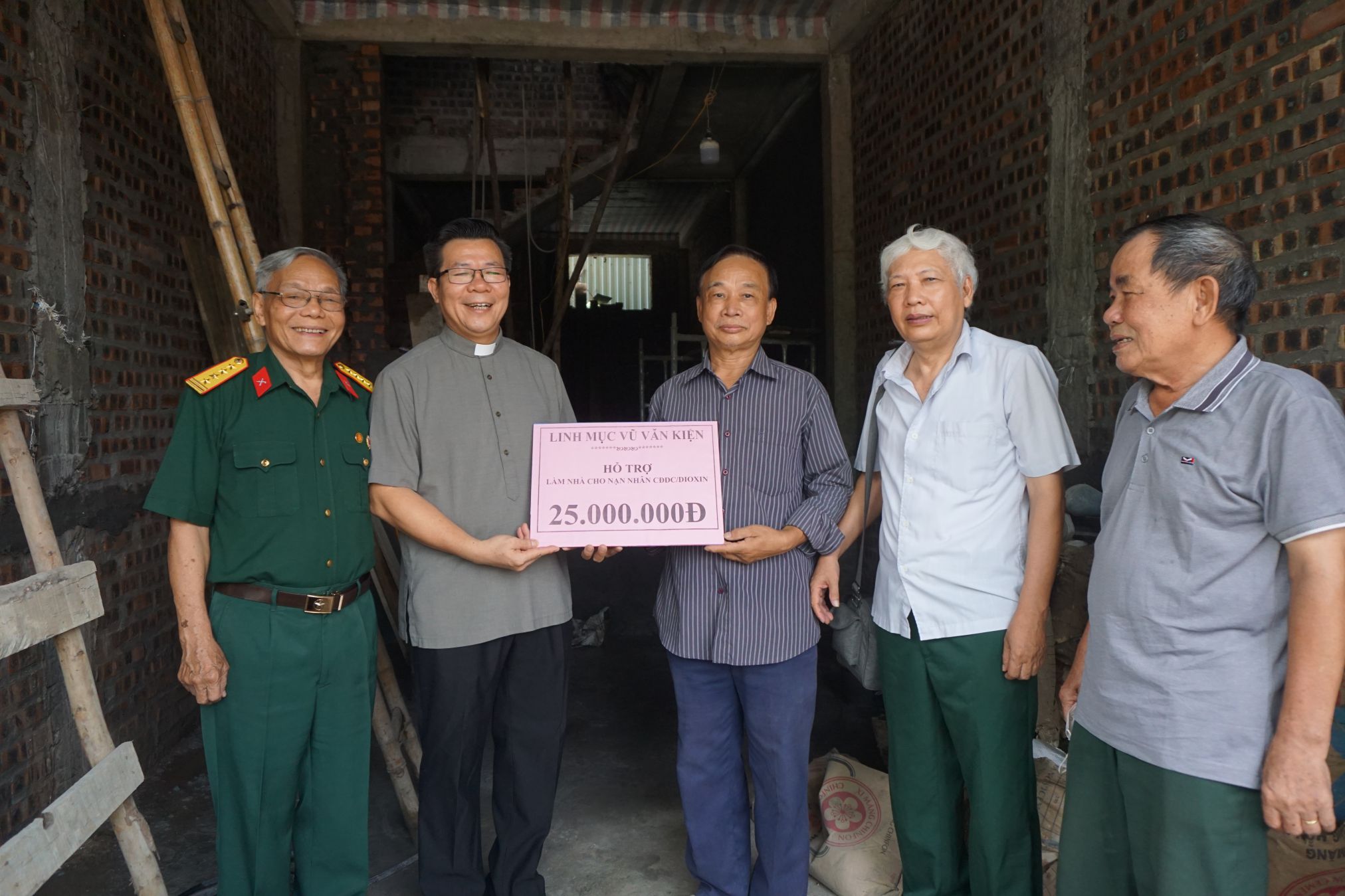 Linh mục Vũ Văn Kiện đại diện của Tòa Giám mục Hải Phòng trao tiền hỗ trợ nạn nhân Lê Hữu Phan xây nhà