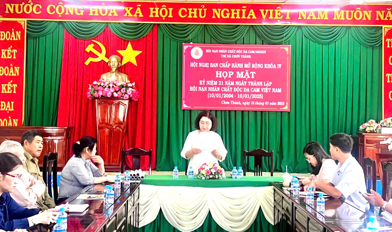 Kỷ niệm 21 năm Ngày thành lập Hội NNCĐDC/dioxin Việt Nam (10/1/2004-10/1/2025), bà Nguyễn Thị Kim Cúc, Chủ tịch Hội NNCĐDC/dioxin thị xã Chơn Thành đã phát biểu giới thiệu về quá trình, hình thành và phát triển của Hội NNCĐDC/dioxin Việt Nam, Tỉnh hội Bình Phước và Thị hội Chơn Thành; Phát động, kêu gọi cộng đồng chung tay hỗ trợ cho NNCĐDC và gia đình để họ vơi đi phần nào nỗi đau da cam.