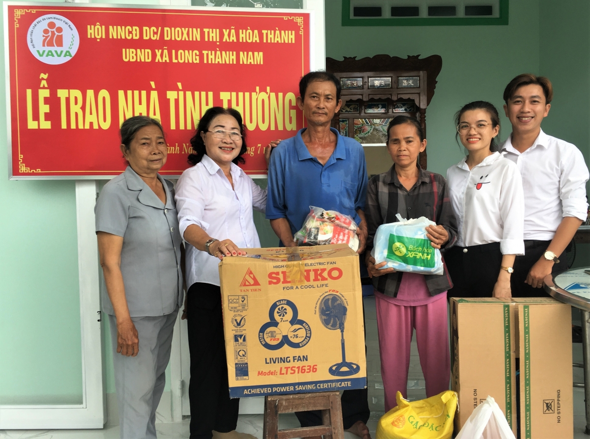 Nhân dịp này mạnh thường quân còn tặng cho gia đình một số vật dụng sinh hoạt gồm: quạt bàn, bếp ga, nồi cơm điện, bình đun nước siêu tốc; Hội NNCĐDC/dioxin xã Long Thành Nam tặng quà gồm: gạo, mỳ và nhu yếu phẩm.