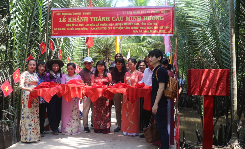 Ngày 24/10/2020, Hội NNCĐDC/dioxin- Bảo vệ quyền trẻ em tỉnh Bến Tre phối hợp với Nghệ sĩ Ưu tú Ngọc Mai, Chủ nhiệm Câu lạc bộ Từ thiện “Ánh Trăng” thành phố Hồ Chí Minh; Ủy ban nhân dân xã Phước Hiệp, huyện Mỏ Cày Nam tổ chức khánh thành và bàn giao đưa vào sử dụng cầu Minh Hương liên ấp An Thới - An Hòa, xã Phước Hiệp, huyện Mỏ Cày Nam. Đến dự có bà Lê Thị Thanh Vân, Chủ tịch Hội NNCĐDC/dioxin- Bảo vệ quyền trẻ em tỉnh Bến Tre, Nghệ sĩ ưu tú Ngọc Mai, Chủ nhiệm Câu lạc bộ Từ thiện “Ánh Trăng”