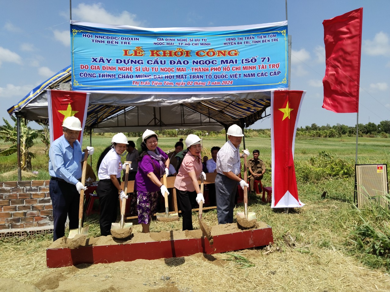 Được sự tài trợ kinh phí xây dựng cầu nông thôn của gia đình Nghệ sĩ Ưu tú Ngọc Mai- Thành phố Hồ Chí Minh, ngày 02/3/2024 Hội NNCĐDC/dioxin- BVQTE tỉnh Bến Tre kết nối với Nghệ sĩ Ưu tú Ngọc Mai về thị trấn Tiệm Tôm, huyện Ba Tri tổ chức lễ khởi công xây dựng cầu Đào Ngọc Mai (Số 7) tại khu phố An Bình, thị trấn Tiệm Tôm, huyện Ba Tri, tỉnh Bến Tre. Bà Đặng Thị Phượng- Phó Chủ tịch Ủy ban Mặt trận Tổ quốc Việt Nam tỉnh Bến Tre, bà Võ Thị Thủy- Chủ tịch Hội NNCĐDC/dioxin- BVQTE tỉnh Bến Tre, Nghệ sĩ Ưu tú Ngọc Mai, cùng lãnh đạo, các ngành, đoàn thể thị trấn Tiệm Tôm và nhân dân địa phương khu phố An Bình, thị trấn Tiệm Tôm, huyện Ba Tri dự.