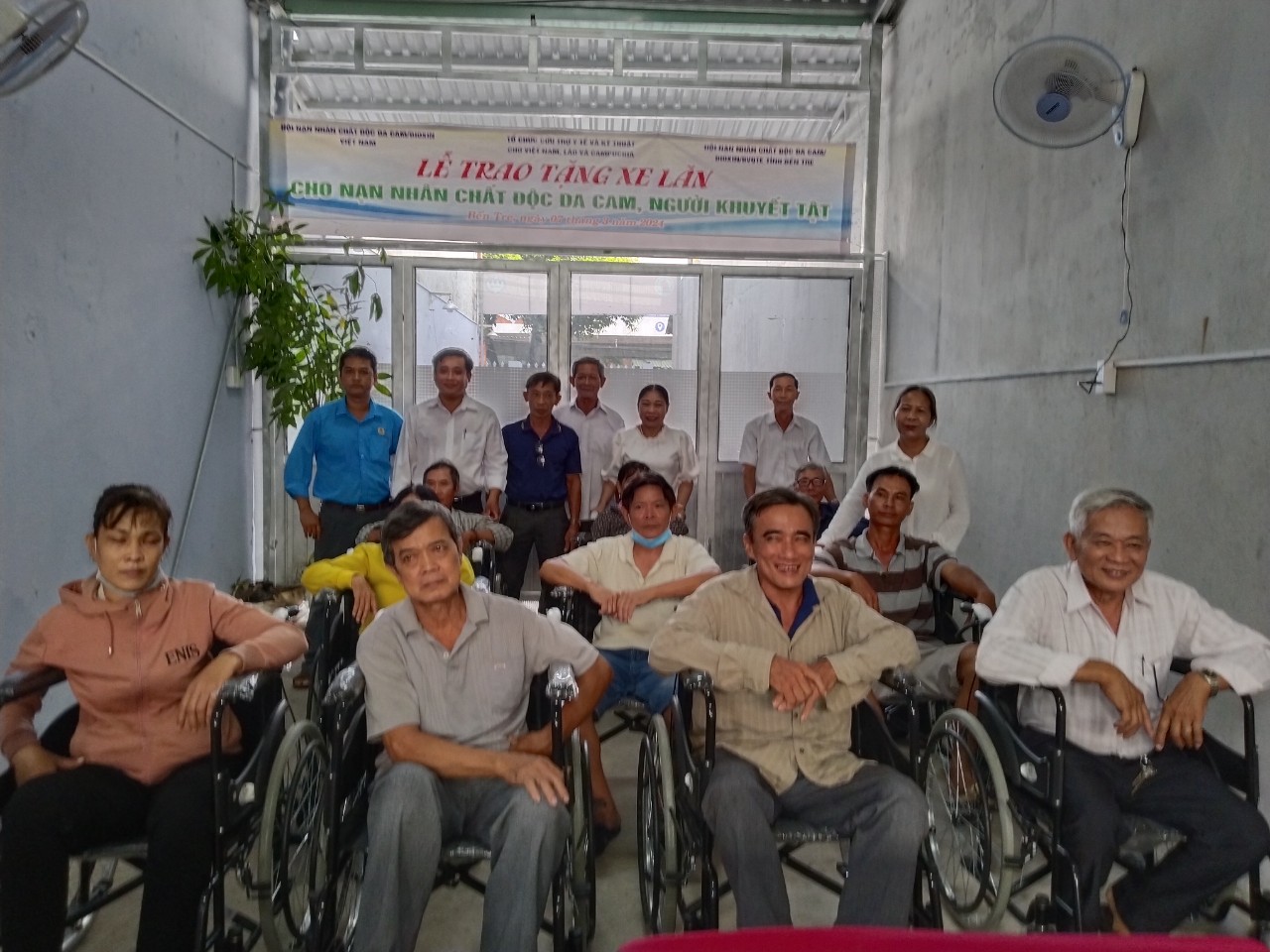 Để tạo điều kiện chăm sóc giúp đỡ cho nạn nhân chất độc da cam và người khuyết tật có phương tiện đi lại, thuận tiện trong sinh hoạt. Ngày 07/3/2024, tại Văn phòng Hội NNCĐDC/dioxin- BVQTE tỉnh Bến Tre, Thường trực Hội tỉnh đã tổ chức chương trình trao tặng 10 chiếc xe lăn cho nạn nhân chất độc da cam và người khuyết tật; mỗi chiếc xe trị giá 2.100.000 đồng; với tổng số tiền 21.000.000 đồng, do Hội Nạn nhân chất độc da cam/dioxin Việt Nam tặng.