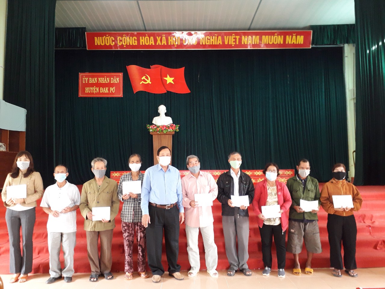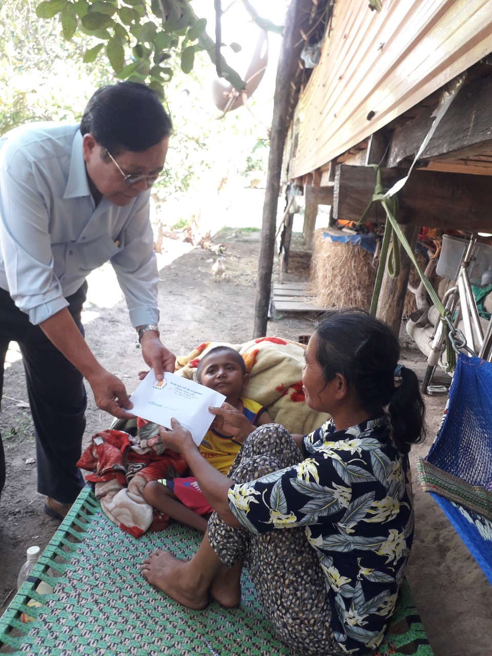 Ông Bùi Thanh Hoàng, trao tiền hỗ trợ nuôi dưỡng tại gia đình cho nạn nhân và trẻ khuyết tật tại thị xã Ayun Pa