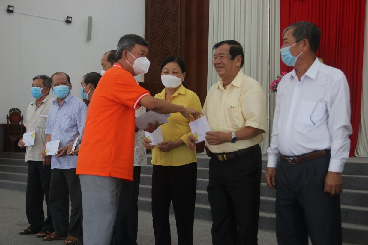 Ông Thái Vũ, Phó Chủ tịch Hội NNCĐDC/dioxin tỉnh (áo màu cam) trao quà cho NNCĐDC huyện Long Mỹ trong dịp Tết Nguyên đán 2022.
