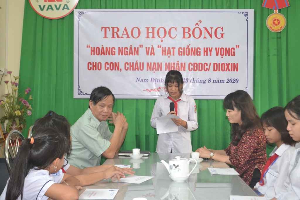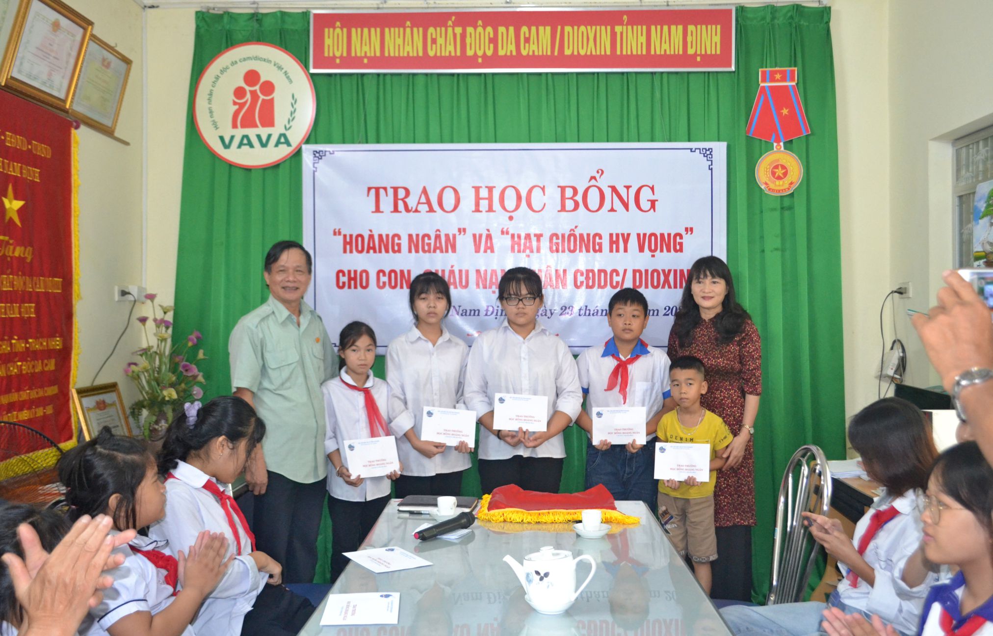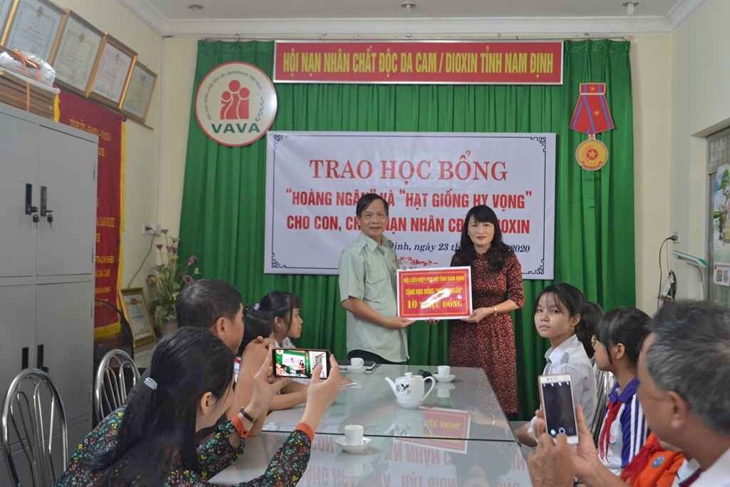 Hưởng ứng Tháng hành động “Vì NNCĐDC” (10/8), sáng ngày 23/8/2020, Hội NNCĐDC/dioxin tỉnh Nam Định phối hợp với Hội Liên hiệp Phụ nữ tỉnh tổ chức trao học bổng cho 13 cháu là con, cháu NNCĐDC có hoàn cảnh khó khăn vươn lên đạt thành tích tốt trong học tập, năm học 2019 – 2020. Trong đó có 10 cháu được nhận học bổng “Hoàng Ngân” và 3 cháu được nhận học bổng “Hạt giống Hy vọng”.