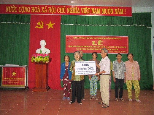 Hội tỉnh đã phối hợp với Hội huyện Bình Sơn tổ chức trao 06 con bò giống, mỗi con trị giá 12 triệu đồng cho 06 gia đình nạn nhân có hoàn cảnh đặc biệt khó khăn trong huyện. Đây là nguồn kinh phí do Hội NNCĐDC/dioxin tỉnh vận động Giáo sư, Tiến sĩ khoa học, Bác sĩ Phan Thị Phi Phi và nhóm hảo tâm tại Hà Nội, thành phố Hồ Chí Minh hỗ trợ.