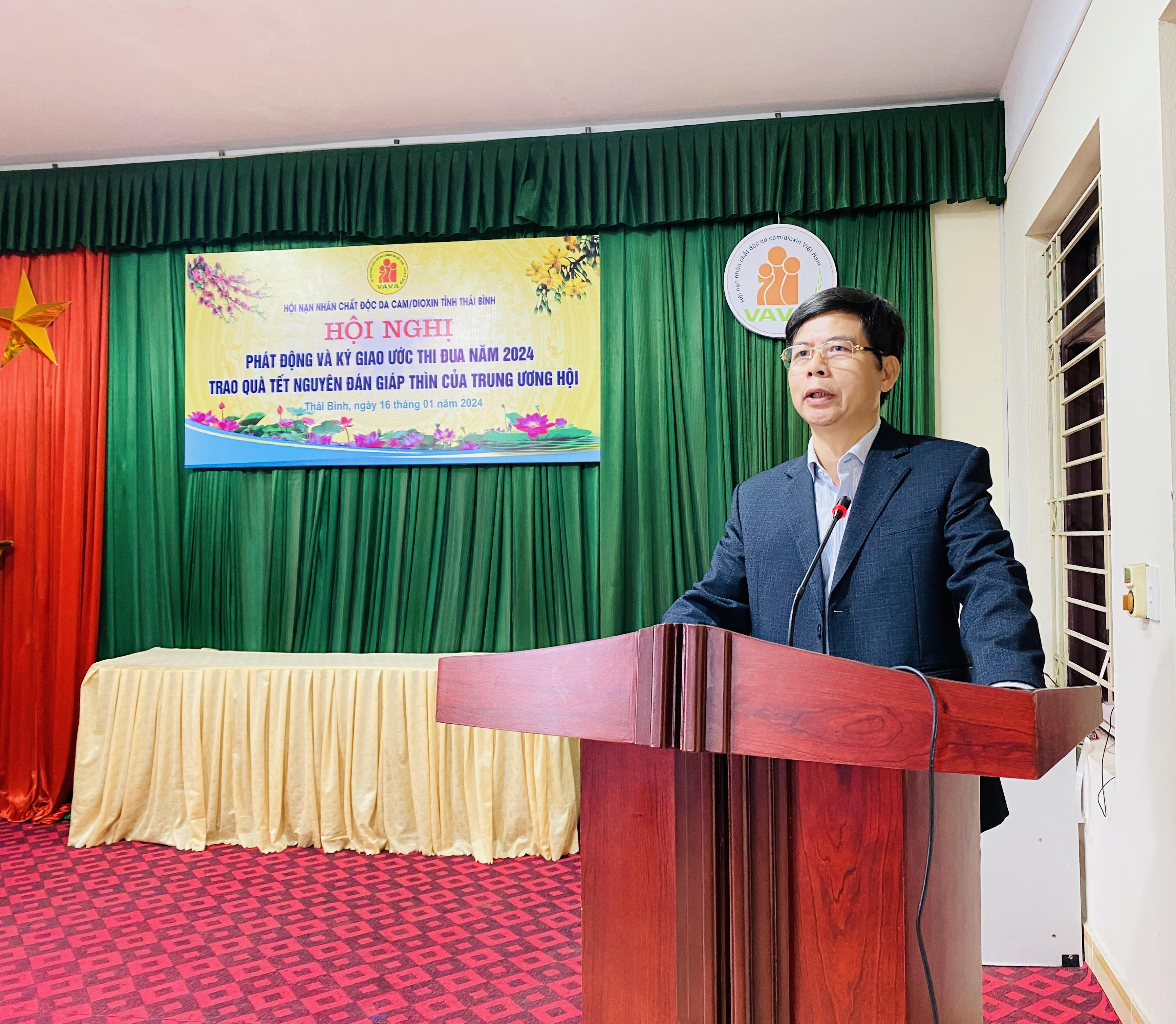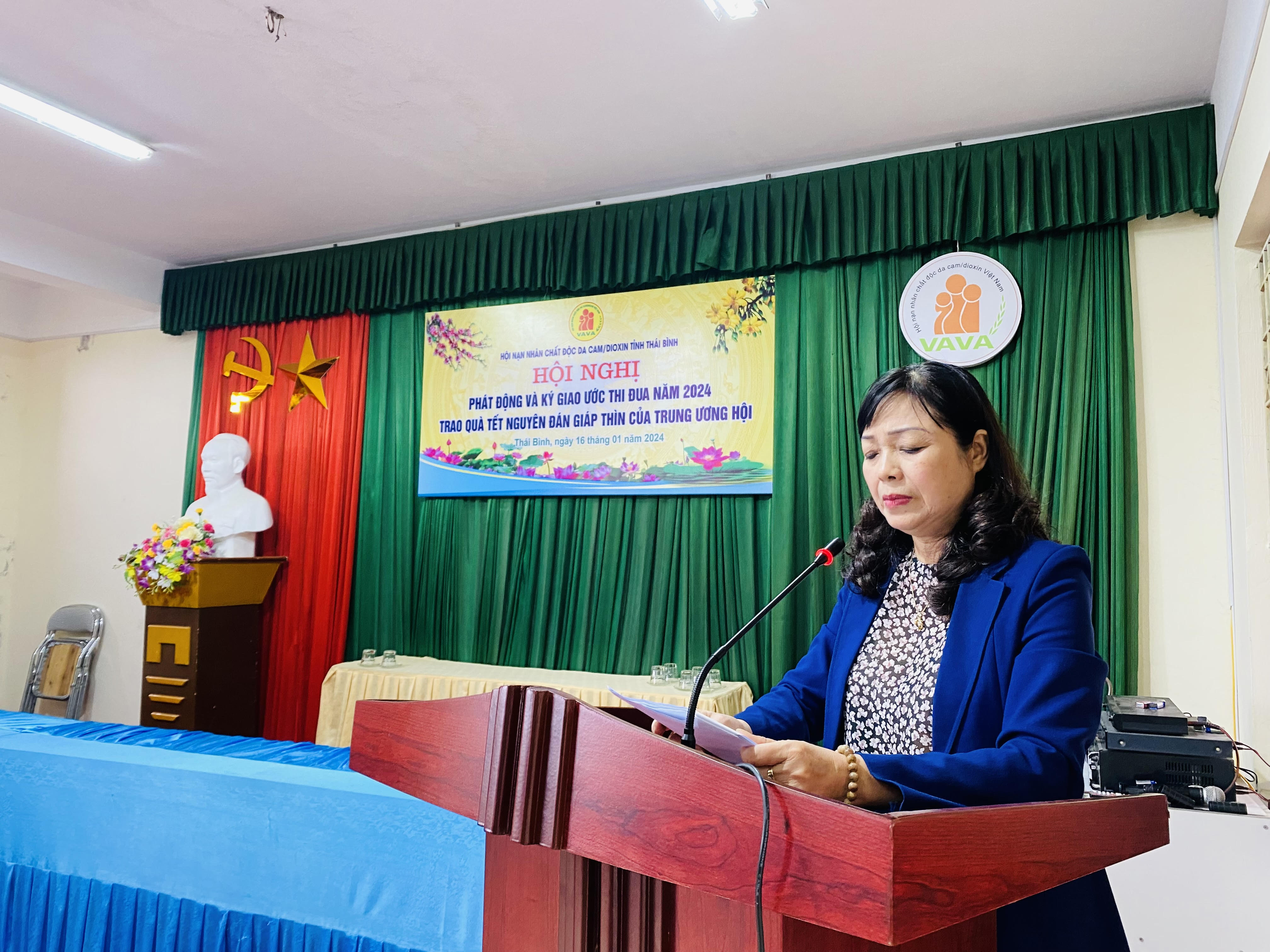 Phát biểu tại Hội nghị, Đại tá Phạm Xuân Hưng, Phó Chủ tịch Hội NNCĐDC/dioxin Việt Nam ghi nhận và đánh giá cao kết quả đạt được của Hội NNCĐDC/dioxin tỉnh Thái Bình trong năm 2023, sang năm 2024 tiếp tục phát huy thành tích đã đạt được, các cấp hội đoàn kết, trách nhiệm cần sâu sát cơ sở, hướng về cơ sở, tiếp tục vận động tạo nguồn lực chăm lo cho NNCĐDC và gia đình của họ và chăm lo cho hội viên có hoàn cảnh khó khăn có điều kiện vươn lên trong cuộc sống. Nhân dịp này Trung ương Hội NNCĐDC/dioxin Việt Nam đã trao tặng 30 suất quà, mỗi suất quà trị giá 1 triệu 200 ngàn đồng cho NNCĐDC đặc biệt khó khăn.