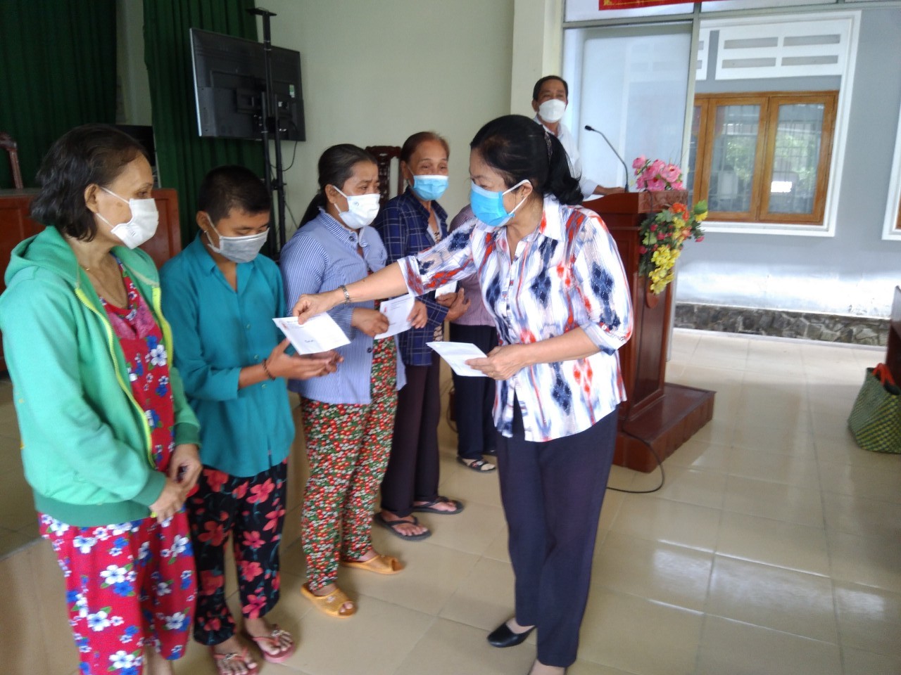 Bà Dương Thị Lệ, Chủ tịch Tỉnh hội, trao quà cho nạn nhân huyện Chợ Gạo