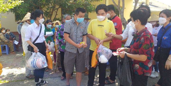 Quý Phật tử Đạo tràng Tịnh xá Ngọc Vinh trao quà và gửi lời chúc bình an, hạnh phúc, sức khỏe đến toàn thể bà con
