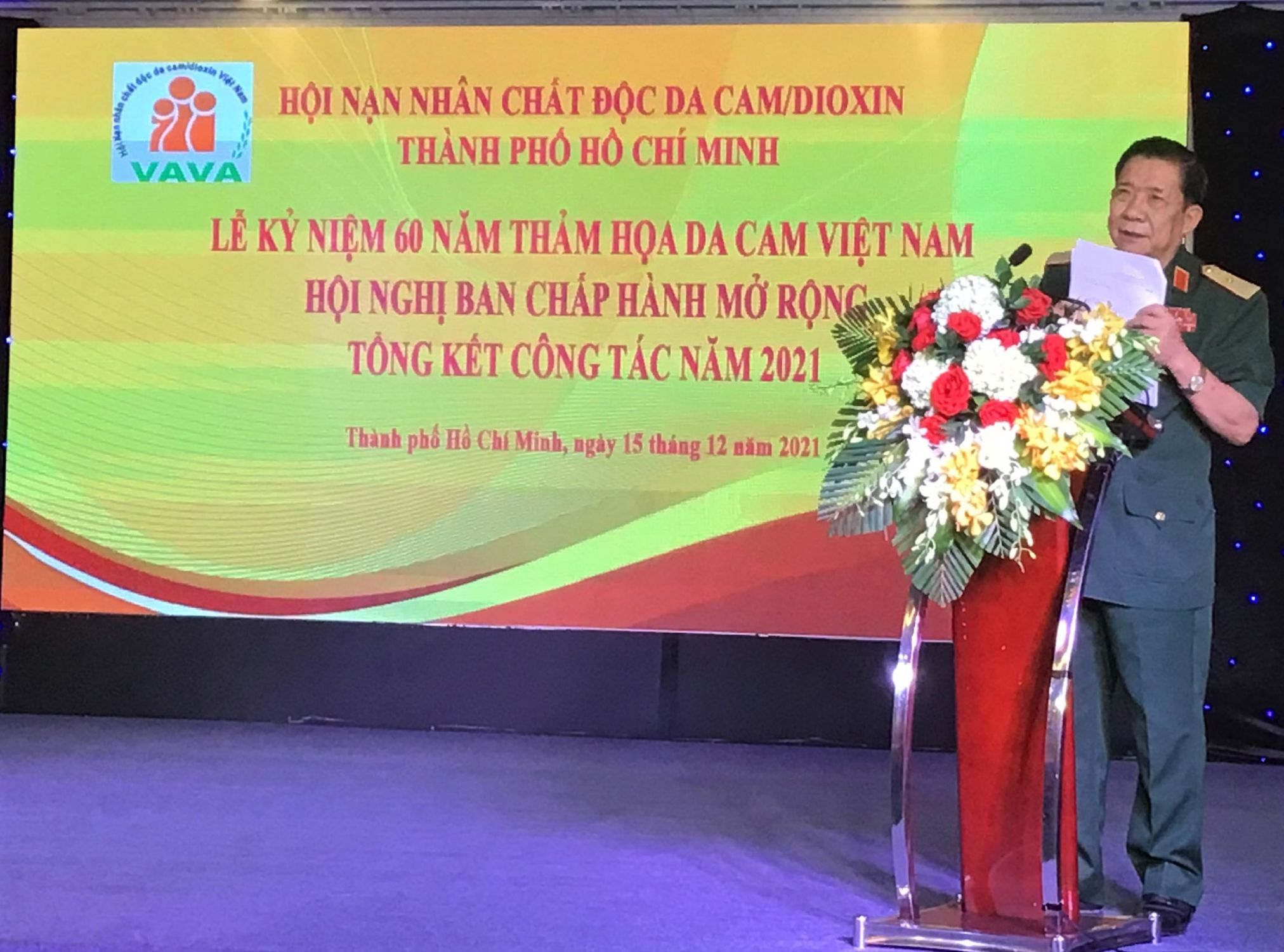 Thiếu tướng Trần Ngọc Thổ, Phó Chủ tịch Hội NNCĐDC/dioxin Việt Nam, Chủ tịch Hội NNCĐDC/dioxin TP. Hồ Chí Minh báo cáo tổng kết 10 năm thực hiện phong trào “Hành động vì NNCĐDC” giai đoạn 2011 – 2021.