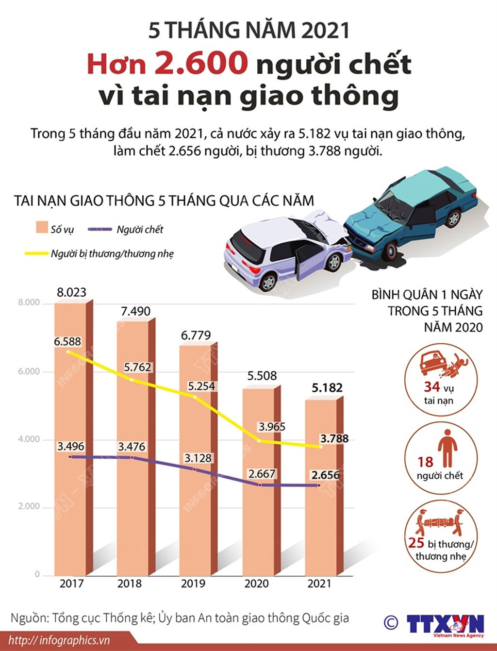 Trong 5 tháng đầu năm 2021, cả nước xảy ra 5.182 vụ tai nạn giao thông, làm chết 2.656 người, bị thương 3.788 người.
