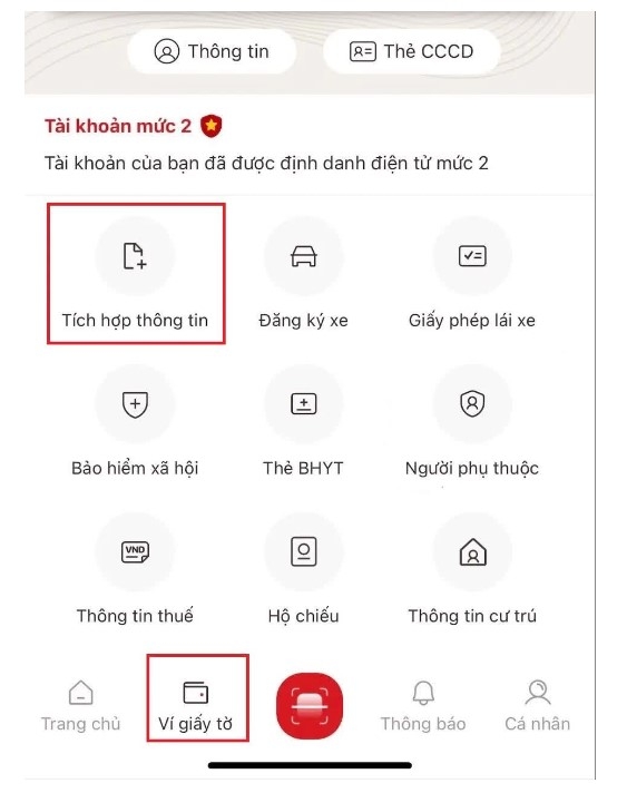 Bước 2: Tại giao diện chính của ứng dụng, bạn hãy chuyển sang mục Ví giấy tờ - Tích hợp thông tin