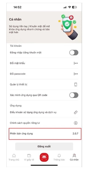 Để kiểm tra phiên bản ứng dụng, người dùng đăng nhập vào VNeID và chọn “Cá nhân”. Nhìn xuống cuối màn hình sẽ thấy phiên bản ứng dụng.