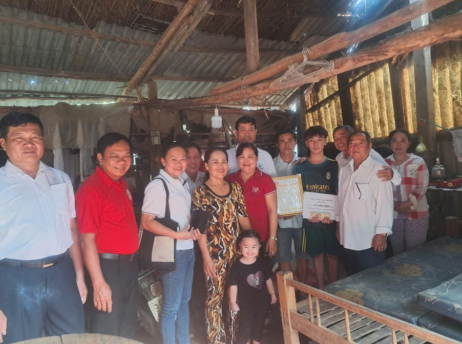 Cấp ủy, chính quyền xã Hòa Khánh Nam và các nhà hảo tâm trao tiền và quà hỗ trợ gia đình cháu Phạm Văn Phước