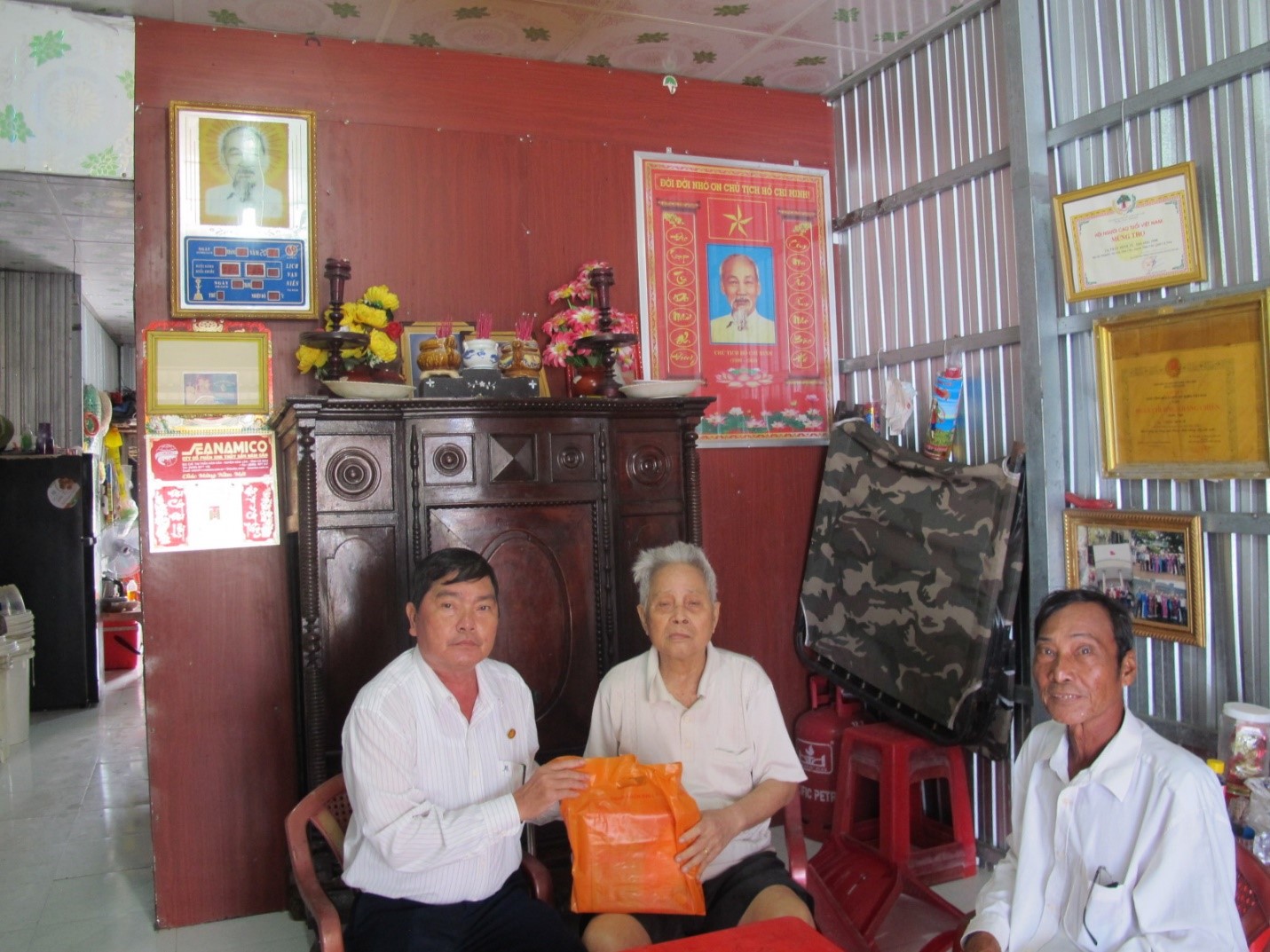 Ông Phạm Minh Sửa (bên trái) Chủ tịch Huyện hội trao quà cho ông Trần Minh Tế NNCĐDC ở Khóm 8, TT Năm Căn