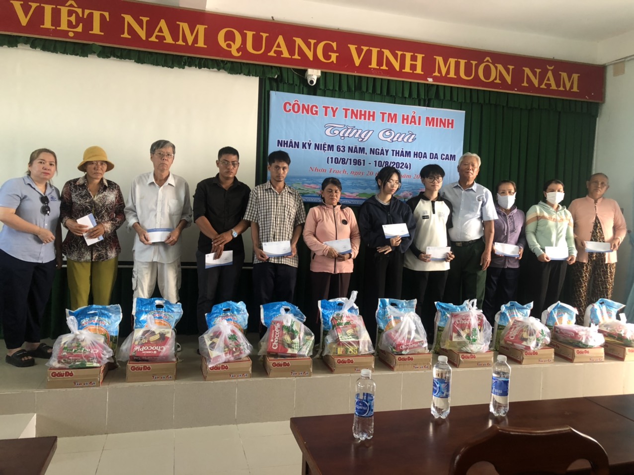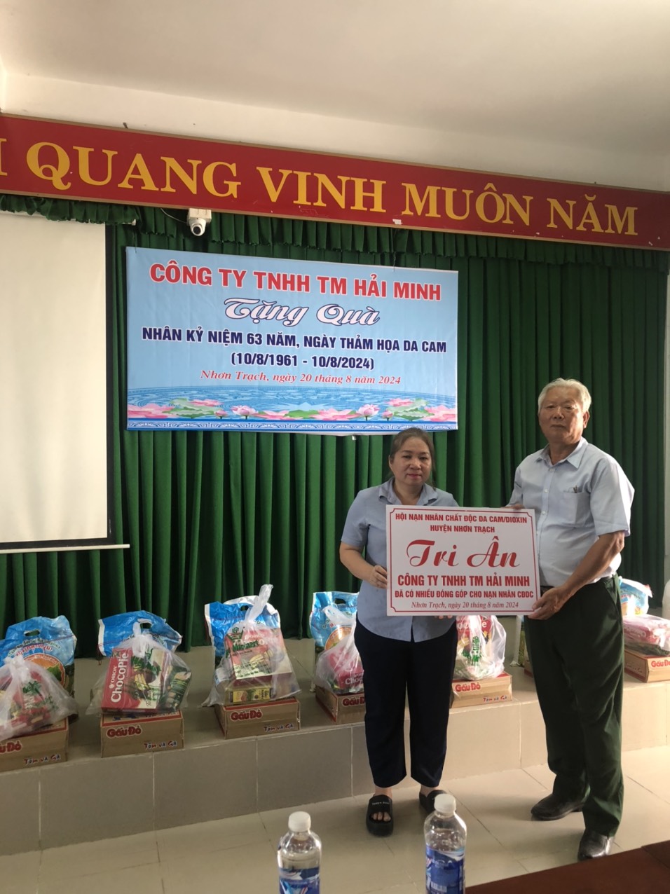 Nhân dịp kỷ niệm 63 năm Thảm họa da cam ở Việt Nam (1961-2024), ngày 20/8, Hội Nạn nhân chất độc da cam/dioxin huyện Nhơn Trạch, tỉnh Đồng Nai đã tặng 150 phần quà cho nạn nhân chất độc da cam có hoàn cảnh đặc biệt khó khăn trên địa bàn huyện, mỗi phần quà gồm tiền và quà, trị giá 700.000đồng; tổng số tiền quà tặng lần này là 105 triệu đồng do Công ty TNHH Thương mại Hải Minh hỗ trợ. Được biết, Công ty TNHH Thương mại Hải Minh luôn đồng hành với Hội huyện và nạn nhân chất độc da cam.