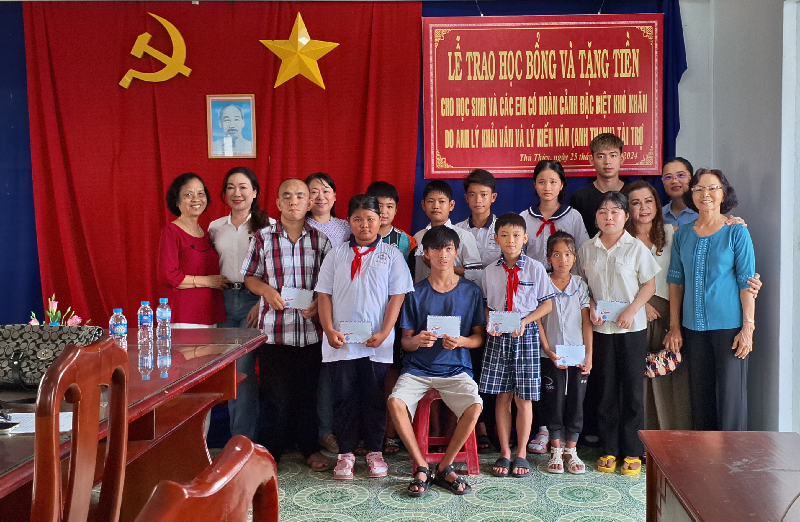 Sáng 25/8 Hội NNCĐDC/dioxin huyện Thủ Thừa trao học bổng cho 10 học sinh bậc tiểu học, trung học cơ sở và học nghề trong huyện có hoàn cảnh đặc biệt khó khăn. Mỗi em được tặng 2 triệu đồng tiền mặt, tổng số tiền học bổng trao tặng lần này là 20 triệu đồng, do anh Lý Khải Văn và Lý Kiến Văn (anh Thanh), con của ông Lý Vĩnh Nam (Việt Kiều Mỹ) tài trợ. Đây là việc làm từ thiện của gia đình ông Lý Vĩnh Nam đã hơn 20 năm nay trong việc làm đường, tặng quà cho NNCĐDC, người khuyết tật và tặng học bổng cho học sinh đặc biệt khó khăn trong huyện, góp phần tiếp sức cho các em đến trường.