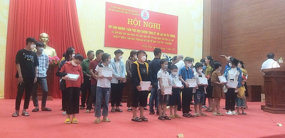 Hội nghị đã trao 145 suất quà tới NNCĐDC và 61 suất học bổng cho con cháu nạn nhân trong huyện: Tỉnh hội trao 40 suất bằng tiền là 20 triệu đồng; Hội Bảo trợ Bệnh nhân nghèo Tỉnh tặng 40 suất là 20 triệu đồng; Hội thành phố Đồng Hới tặng quà "nâng bước đến trường" cho 61 em học sinh là con cháu nạn nhân vượt khó, giá trị tiền hiện vật là 30.000.000; UBND huyện và Huyện hội Minh hóa tặng 30 suất 15 triệu đồng; Tổng số tiền quà trao trao trực tiếp tại Hội nghị trên 100 triệu đồng.