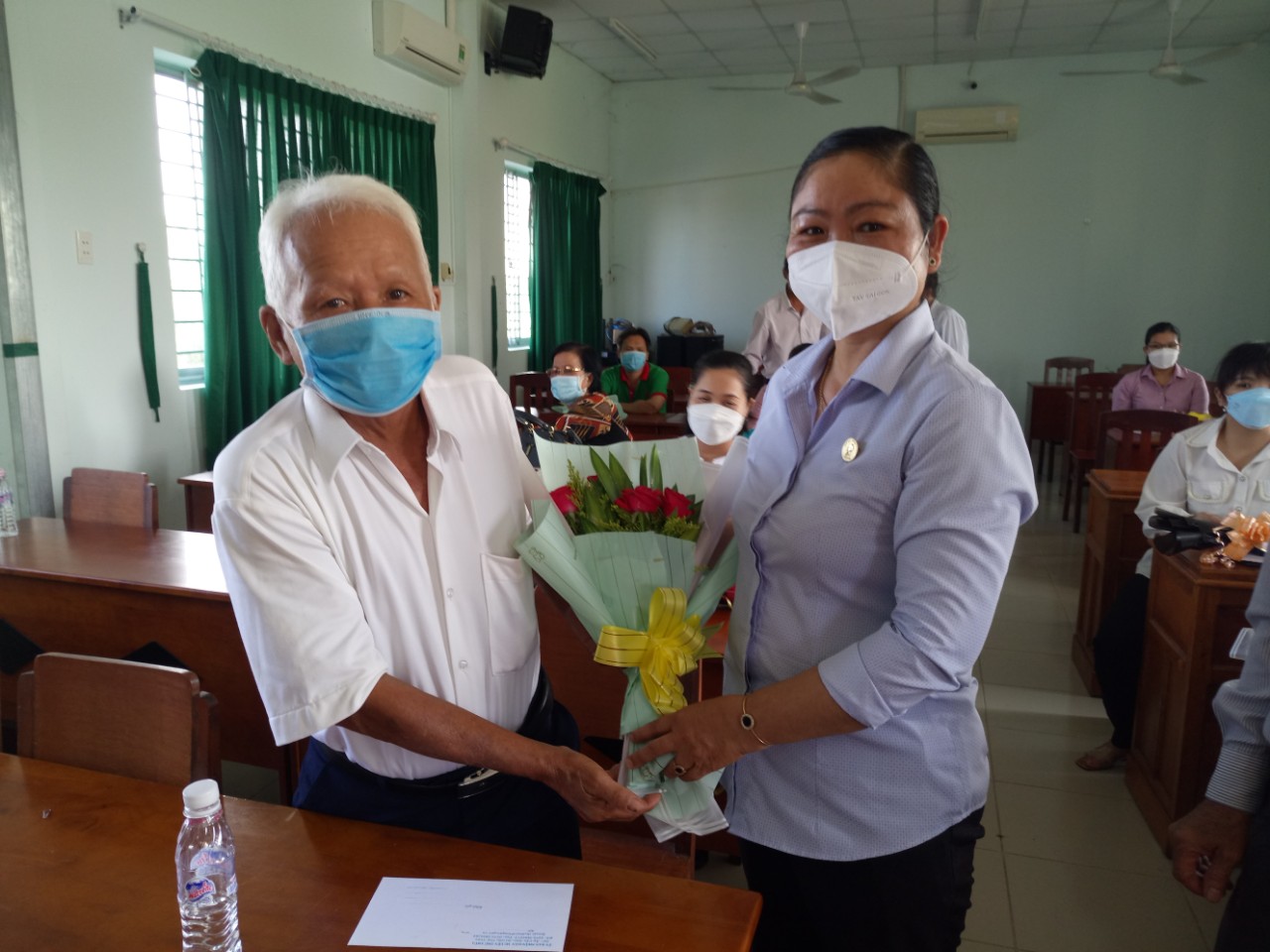 Bà Trần Thị Tím, Chủ tịch MTTQ huyện tặng quà cho giáo viên nghỉ hưu gặp khó khăn từ nguồn tiền xã hội hóa