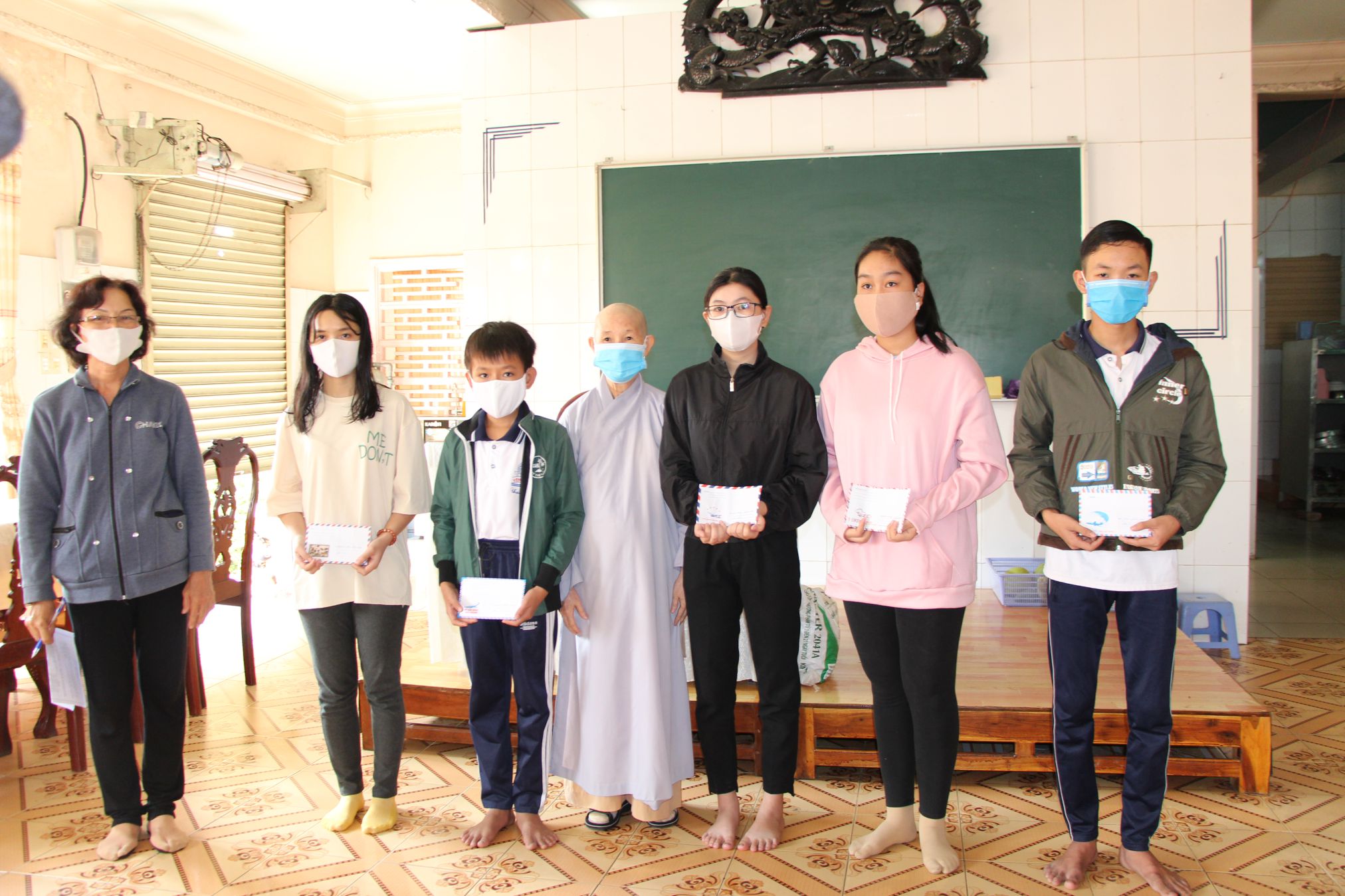 Lãnh đạo Huyện hội cùng Ni sư Tuệ Đăng trao học bổng cho các em.
