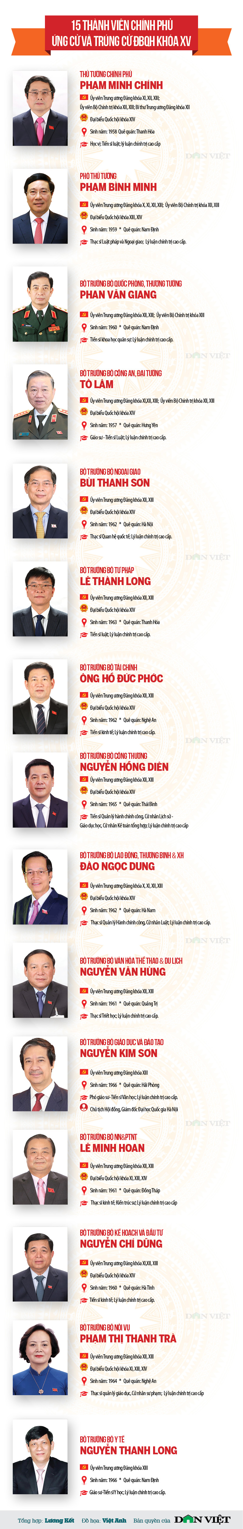 Trong 28 thành viên Chính phủ (gồm Thủ tướng, các Phó Thủ tướng, các Bộ trưởng, Trưởng ngành), có 15 người đã ứng cử và trúng cử đại biểu Quốc hội khóa XV. Dân Việt giới chân dung của về 15 vị lãnh đạo này.