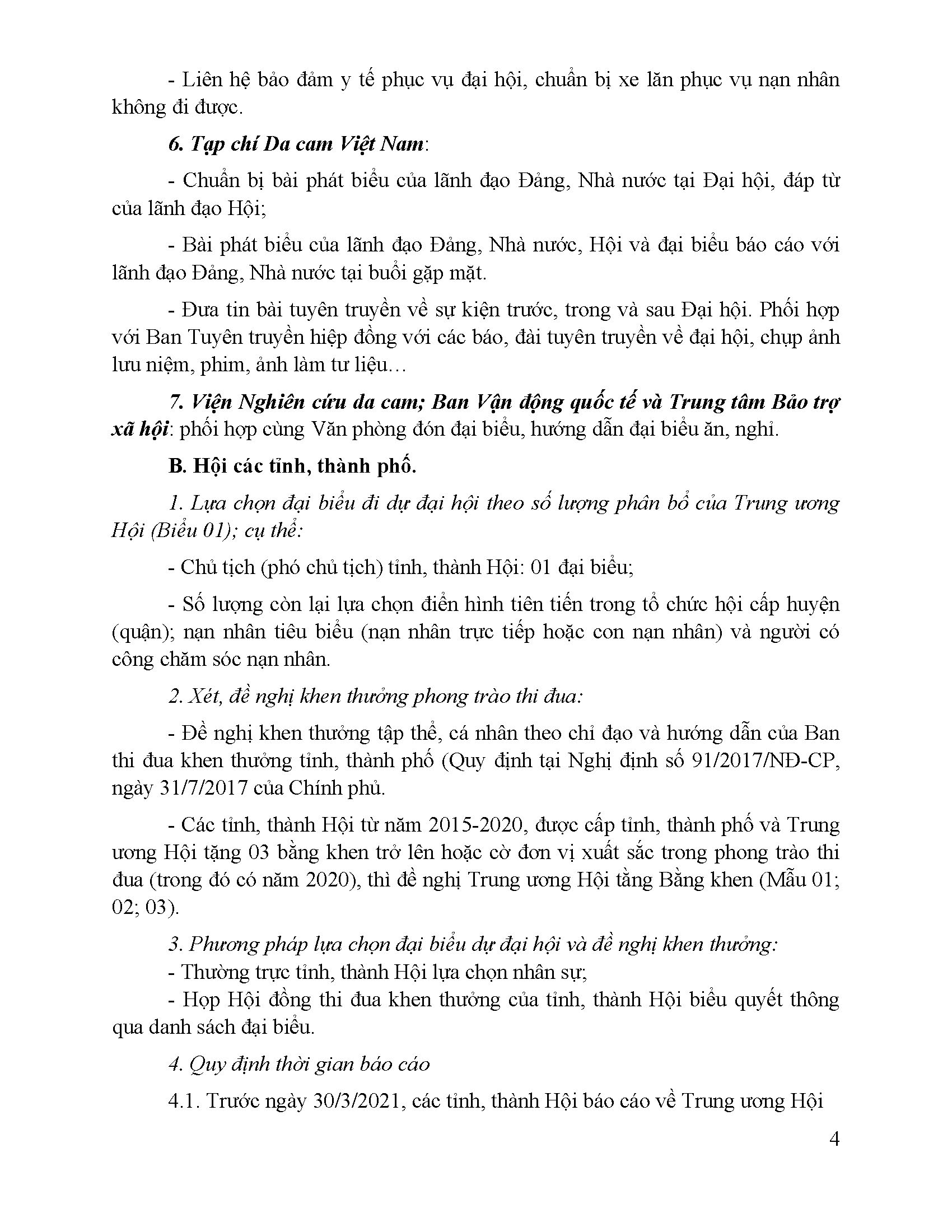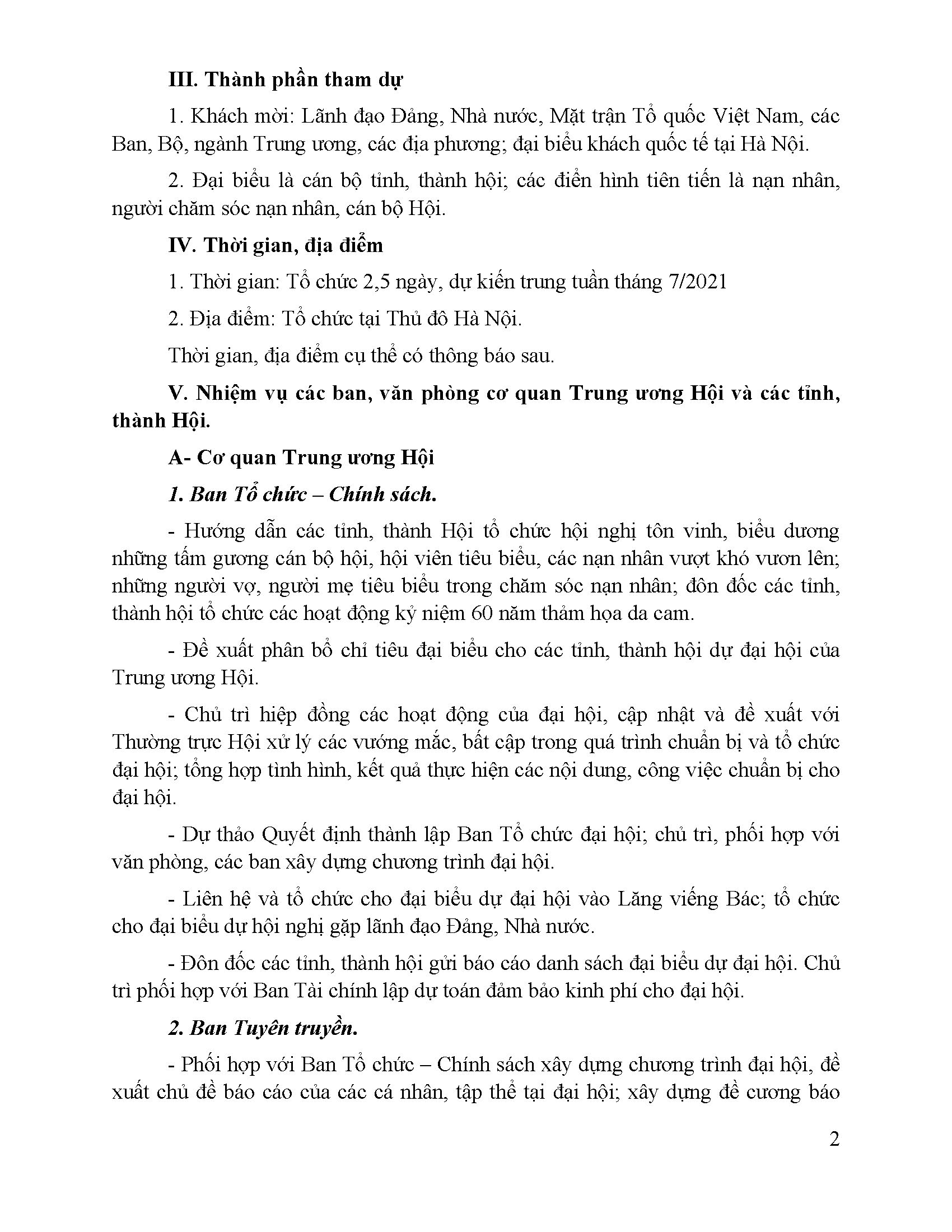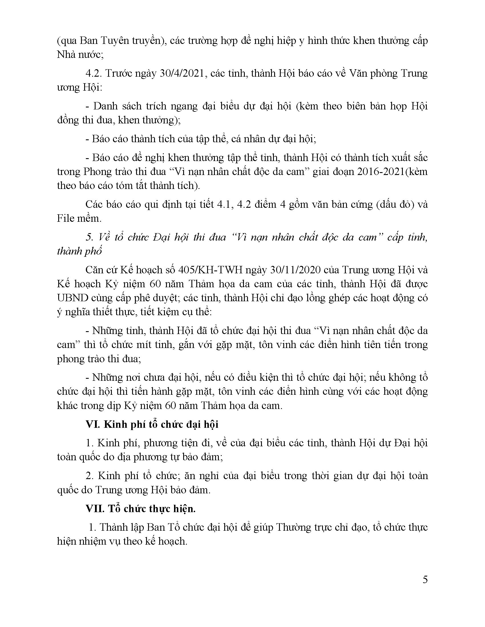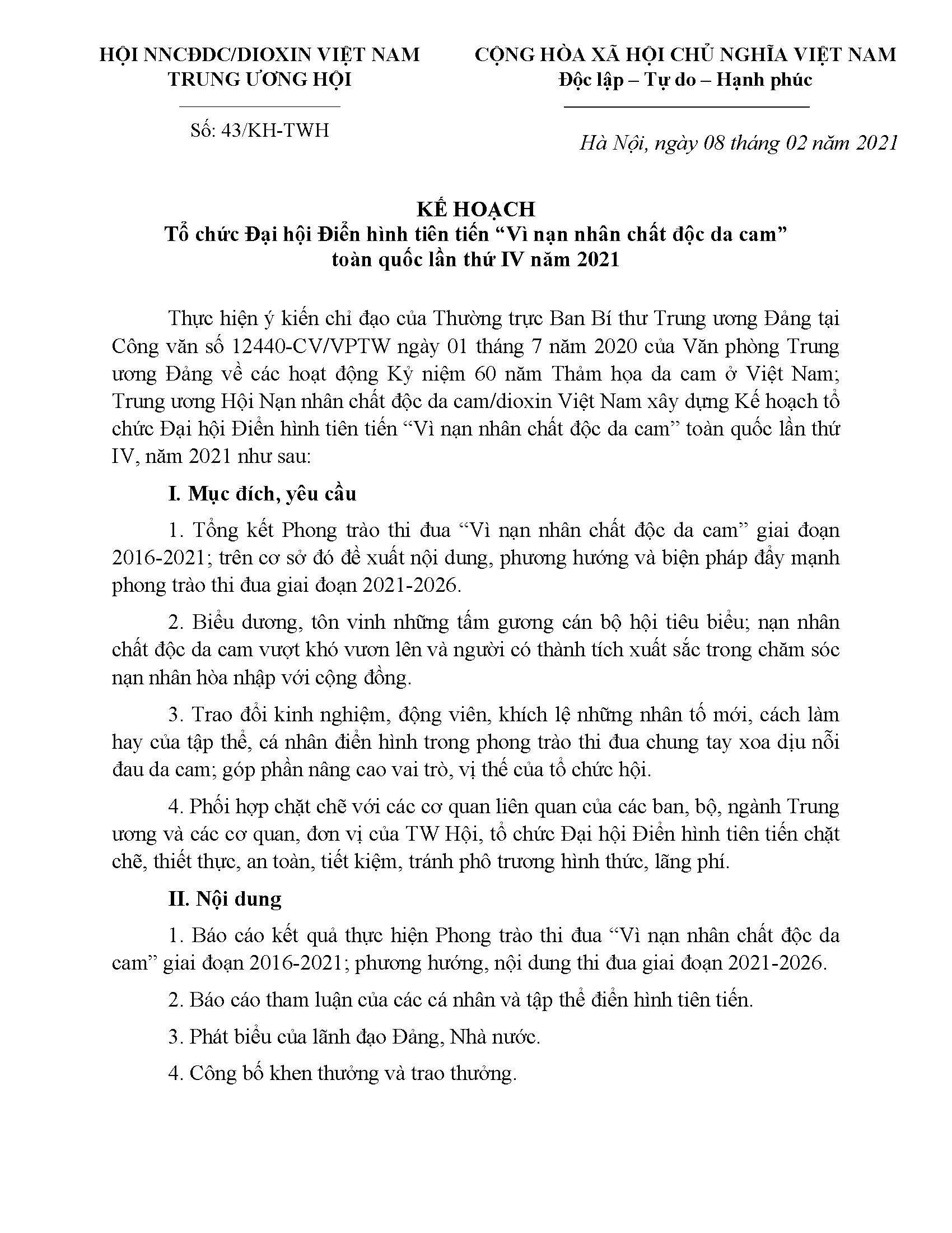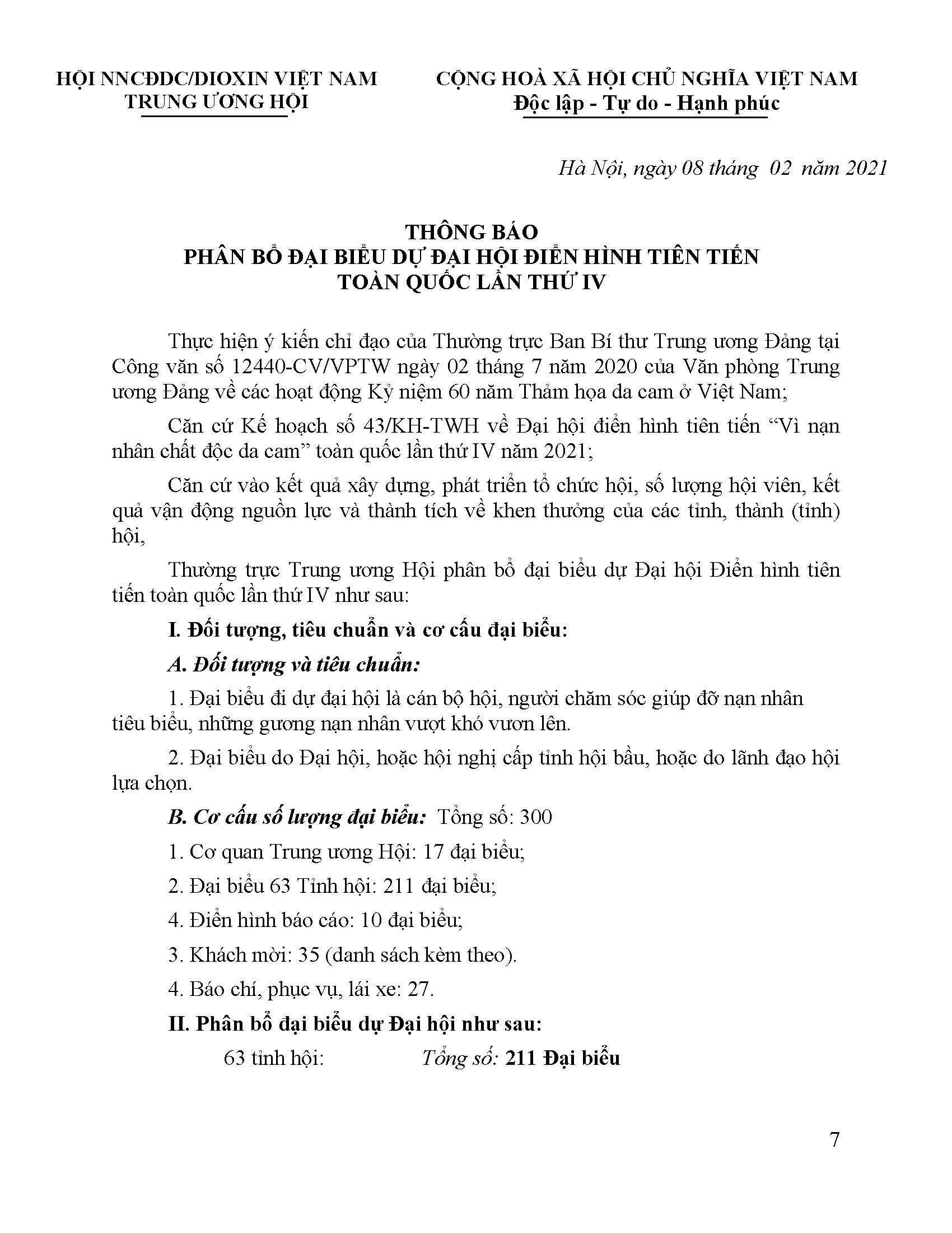 Kế hoạch tổ chức Đại hội Điển hình tiên tiến “Vì nạn nhân chất độc da cam” toàn quốc lần thứ IV năm 2021 và Thông báo phân bổ Đại biểu dự Đại hội điển hình tiên tiến toàn quốc lần thứ IV