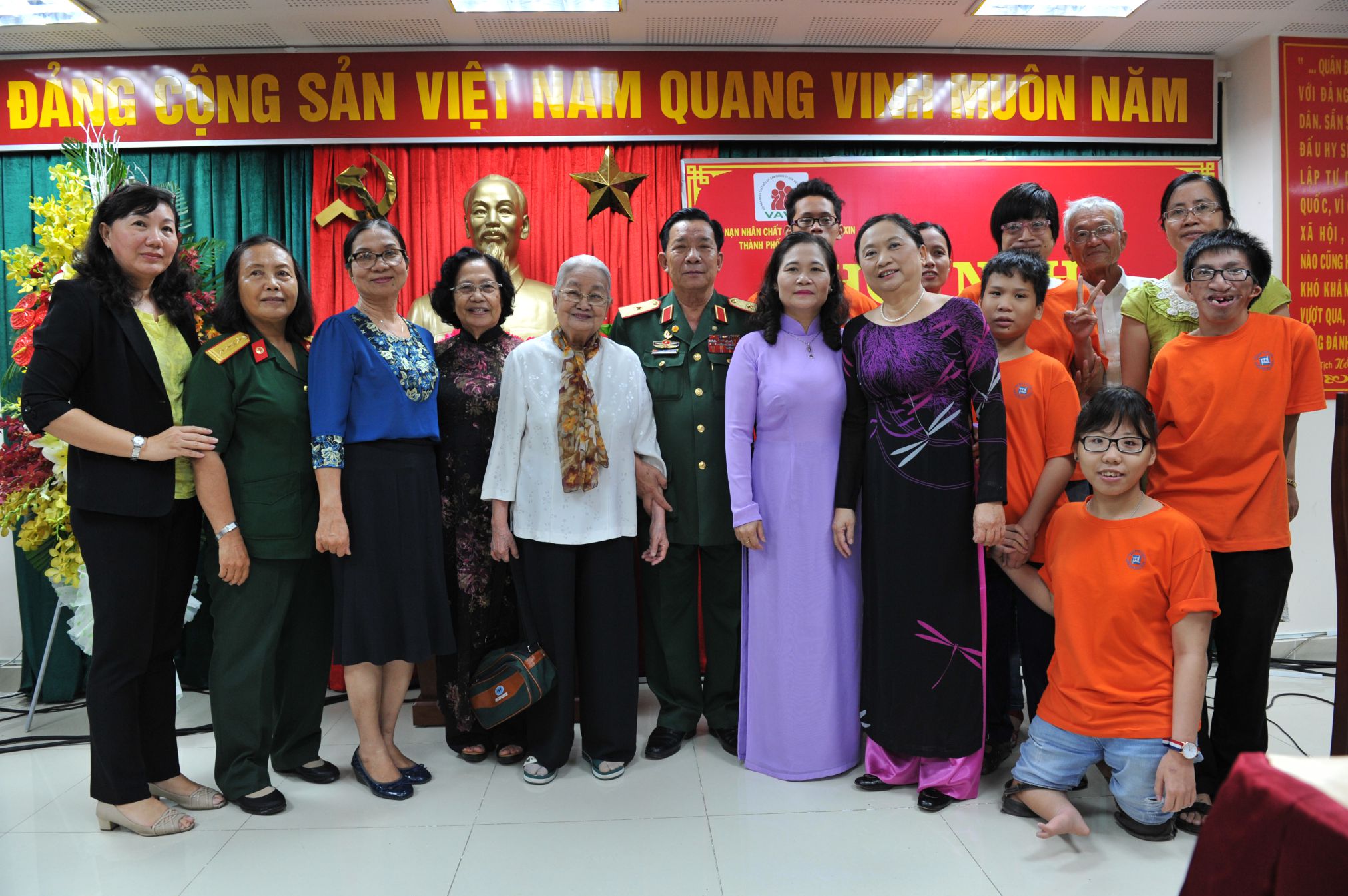 GS-BS Nguyễn Thị Ngọc Phượng (thứ 4 từ trái qua), Thầy thuốc Nhân dân Tạ Thị Chung, Thiếu tướng Trần Ngọc Thổ (người mặc quân phục), Đại diện Lãnh đạo Thành phố và các nhà hảo tâm chụp ảnh lưu niệm với NNCĐDC trong buổi họp mặt kỷ niệm Ngày Thảm họa da cam ở Việt Nam.