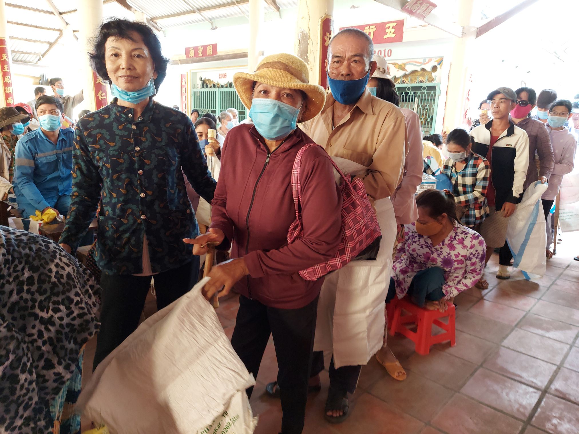 Bà Trần Thị Láng, PCT Huyện hội Thủ Thừa (người mặc áo hoa sẫm màu) trực tiếp trao quà cho nạn nhân, người khuyết tật, người nghèo.