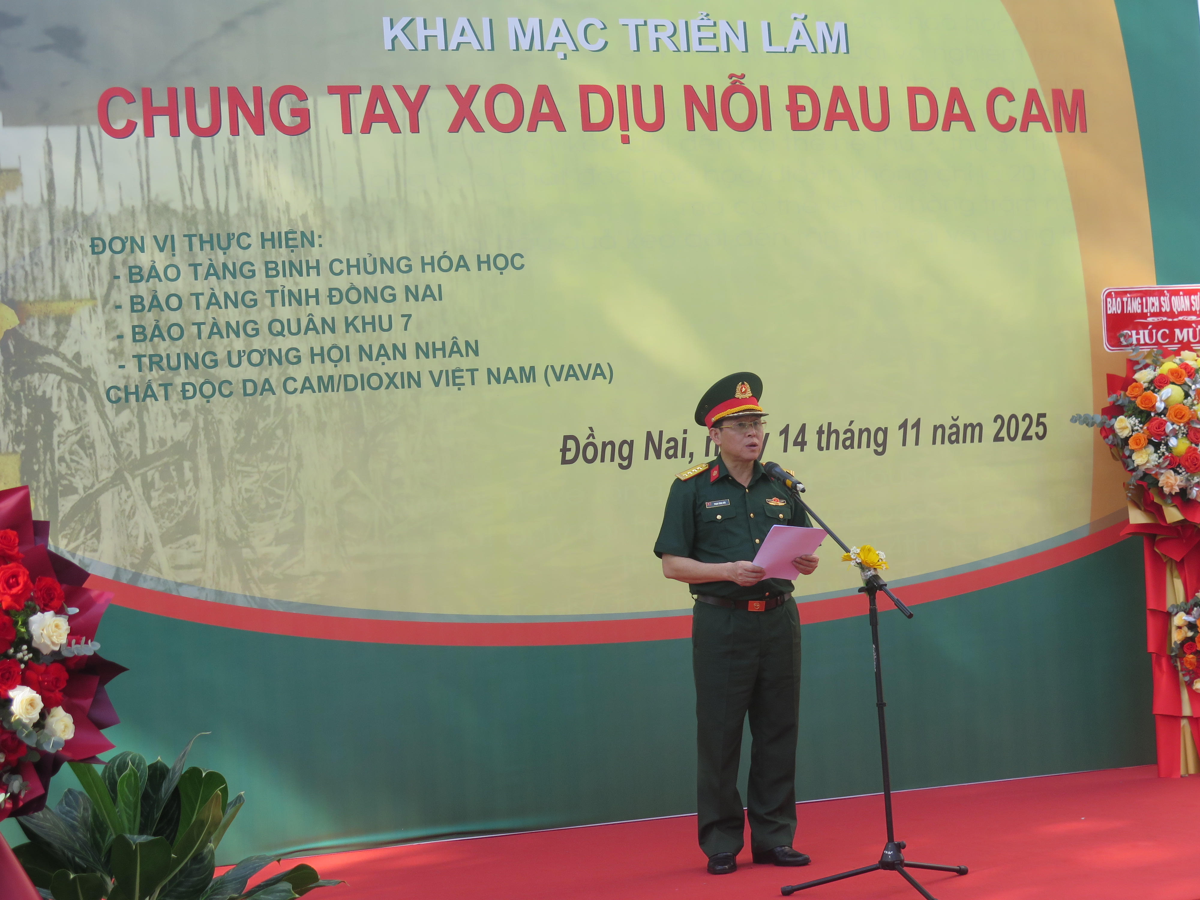 Sáng 14-11, tại Bảo tàng Đồng Nai, Binh chủng Hoá học phối hợp với Quân khu 7, Sở Văn hoá Thể thao và Du lịch tỉnh Đồng Nai, Hội Nạn nhân chất độc da cam/dioxin Việt Nam chỉ đạo tổ chức Triển lãm chuyên đề “Chung tay xoa dịu nỗi đau da cam”. Các đồng chí: Đại tá Phạm Công Hữu, Phó chính ủy Binh chủng Hóa học; Đại tá Nguyễn Anh Tấn, Phó chủ nhiệm Binh chủng Hóa học; Đại tá Thái Thành Đức, Phó chủ nhiệm Chính trị Quân khu 7; Đại tá Phùng Thế Hùng, Phó tham mưu trưởng Quân khu 7; đồng chí Vũ Thanh Ngữ, Phó giám đốc Sở Văn hoá Thể thao và Du lịch tỉnh Đồng Nai, cùng đại diện lãnh đạo các cơ quan, đơn vị đến dự.