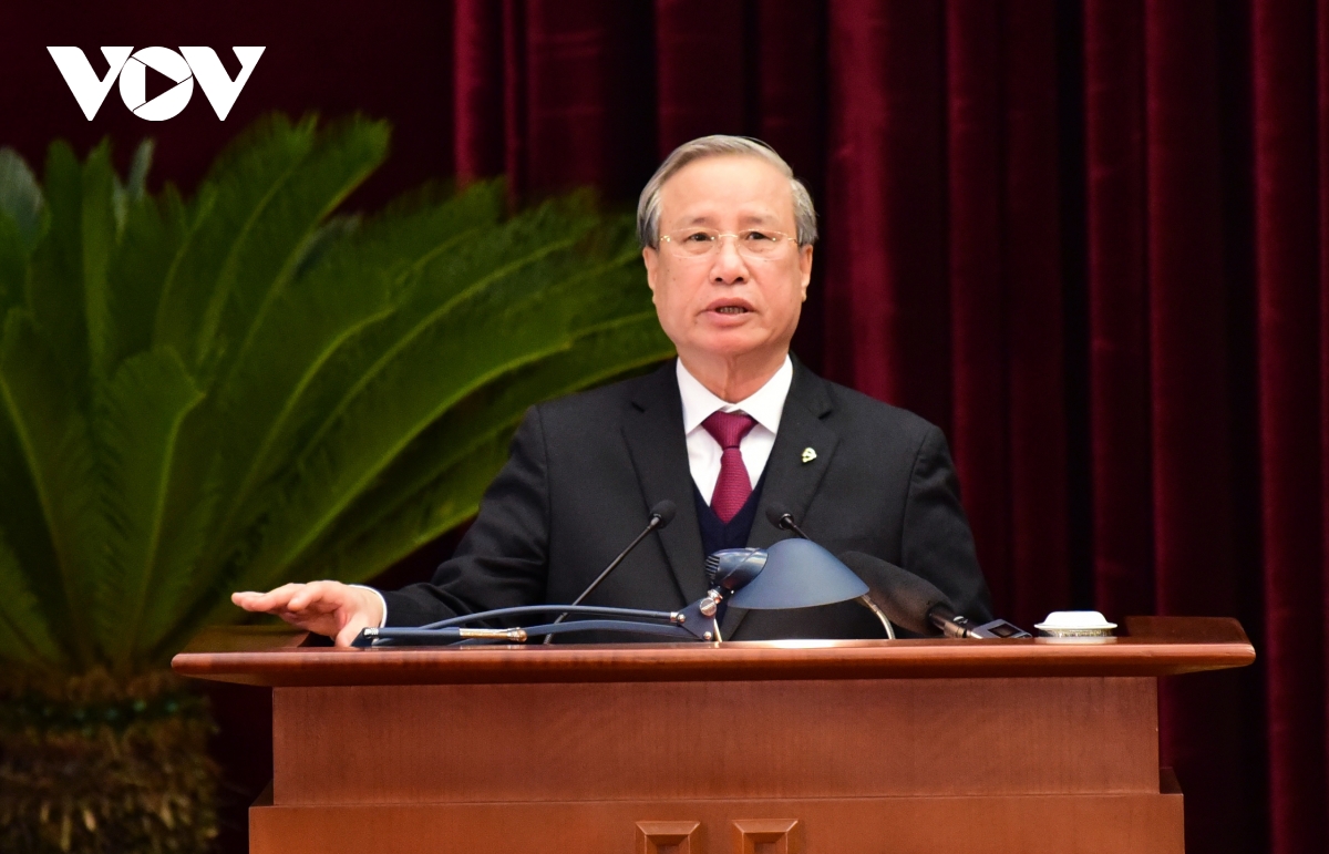 Tại Hội nghị lần này, căn cứ Điều lệ Đảng, Bộ Chính trị trình Trung ương dự kiến danh sách Đoàn Chủ tịch, Đoàn Thư ký, Ban Thẩm tra tư cách đại biểu của Đại hội XIII của Đảng; Ban Chấp hành Trung ương sẽ cho ý kiến thông qua để trình Đại hội XIII của Đảng xem xét, quyết định. Trong ảnh: Uỷ viên Bộ Chính trị, Thường trực Ban Bí thư Trần Quốc Vượng trình bày dự kiến chương trình làm việc của Hội nghị.