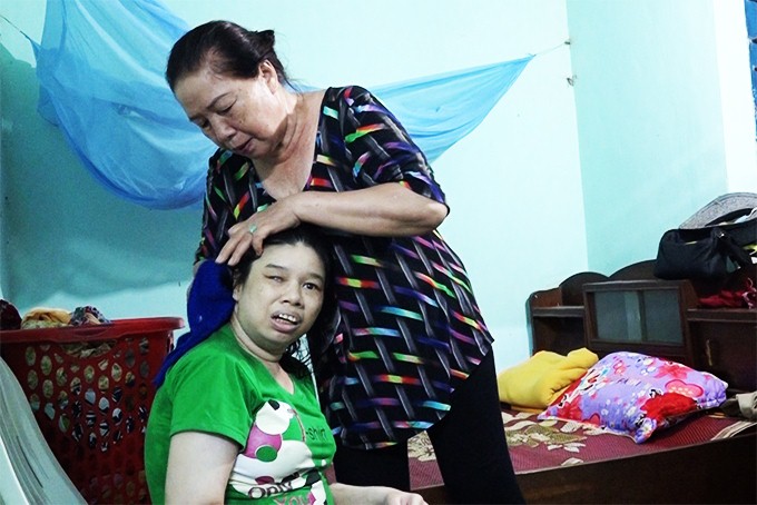 Hai chị em Đỗ Thị Hiếu, Đỗ Thị Vy (xã Vĩnh Lương, TP. Nha Trang) sinh cách nhau chỉ 1 năm, hơn 30 tuổi, trí tuệ bình thường nhưng lại bị “khóa chặt” trong cơ thể không lành lặn, thân hình chỉ như đứa trẻ lên 10, hai tay chân đều bị liệt. Hai chị em bị nhiễm chất độc CĐDC/dioxin từ cha. Hiện nay, mẹ của 2 chị, bà Nguyễn Thị Thẩm (cũng đã có 1 con trai mất vì di chứng CĐDC/dioxin) một mình lo cho 2 chị em từ bữa ăn, giấc ngủ. Thương mẹ, nhưng 2 chị em chỉ có thể trò chuyện với mẹ, an ủi mẹ như liều thuốc xua đi những lo lắng, vất vả mà bà phải gánh chịu bao năm qua. Trò chuyện với chúng tôi, bà rưng rưng nước mắt với trăn trở lớn nhất đó là khi bà qua đời, không ai chăm sóc 2 con của mình.