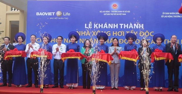 Công trình Nhà xông hơi tẩy độc cho nạn nhân CĐDC tỉnh Thái Bình được Tổng Công ty Bảo Việt Nhân thọ phối hợp với Quỹ Bảo trợ trẻ em Việt Nam và UBND tỉnh Thái Bình tổ chức cắt băng khánh thành, đưa vào sử dụng dịp đầu tháng 4 vừa qua. Thượng tướng Nguyễn Văn Rinh, nguyên Ủy viên Trung ương Đảng, nguyên Thứ trưởng Bộ Quốc phòng, Chủ tịch Hội NNCĐDC/dioxin Việt Nam; bà Nguyễn Thị Hà, Thứ trưởng Bộ Lao động - TBXH; bà Lê Tuyết Mai, Phó Giám đốc Quỹ Bảo trợ trẻ em Việt Nam; bà Trần Thị Bích Hằng, Phó Chủ tịch UBND tỉnh Thái Bình; ông Đào Đình Thi, Chủ tịch HĐQT Tập đoàn Bảo Việt; bà Thân Hiền Anh, Tổng Giám đốc Tổng Công ty Bảo Việt nhân thọ; lãnh đạo các sở, ban ngành của tỉnh và Hội NNCĐDC/dioxin tỉnh Thái Bình cùng tham dự buổi lễ.