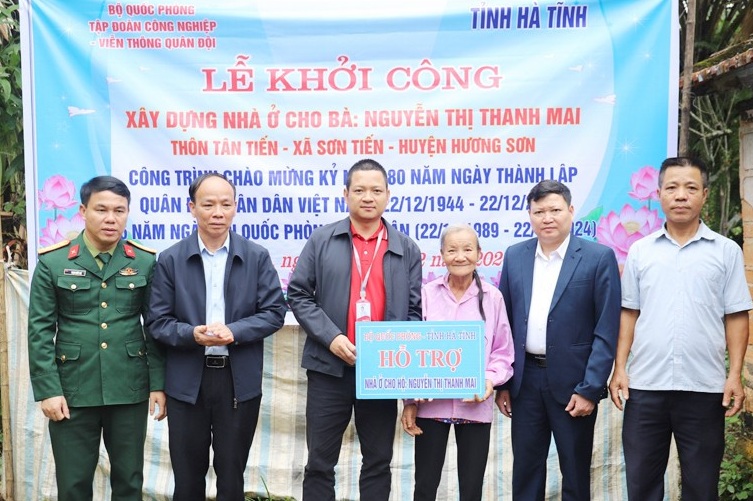 Cùng ngày, Ủy ban MTTQ - Ban Vận động Quỹ Vì người nghèo huyện Hương Sơn tổ chức lễ khởi công làm nhà ở cho gia đình bà Nguyễn Thị Thanh Mai (SN 1964, thôn Tân Tiến, xã Sơn Tiến). Bà Nguyễn Thị Thanh Mai sống một mình, có hoàn cảnh đặc biệt khó khăn về nhà ở (thuộc diện hộ nghèo). Ủy ban MTTQ - Ban Vận động Quỹ “Vì người nghèo” huyện Hương Sơn kết hợp cùng Tập đoàn Công nghiệp - Viễn thông Quân đội và chính quyền xã Sơn Tiến khởi công xây mới ngôi nhà kiên cố cho bà Mai có diện tích khoảng 50m2, trị giá khoảng 80 triệu đồng, trong đó, Tập đoàn Công nghiệp - Viễn thông Quân đội hỗ trợ 50 triệu đồng, phần còn lại do người thân trong gia đình đóng góp, dự kiến hoàn thành trước tết Âm lịch 2025. Ngoài ra, cấp ủy, chính quyền, các tổ chức đoàn thể và Nhân dân sẽ quyên góp, ủng hộ ngày công để gia đình bà Mai sớm hoàn thành ngôi nhà theo đúng tiến độ.