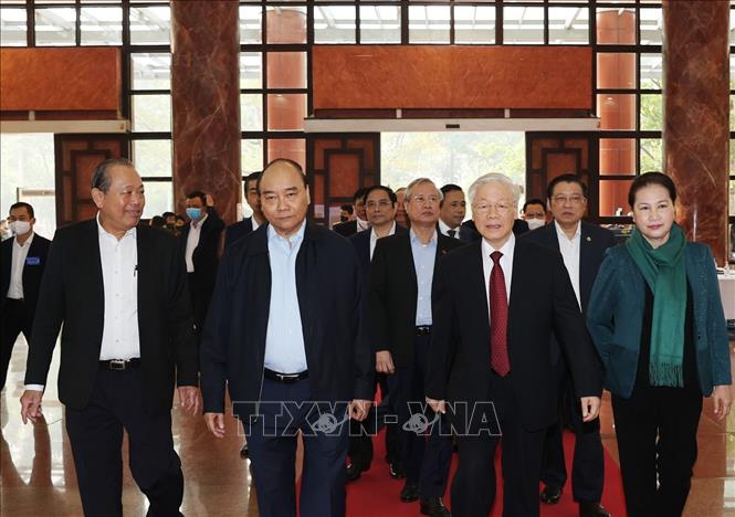 Tổng Bí thư, Chủ tịch nước Nguyễn Phú Trọng, Thủ tướng Nguyễn Xuân Phúc, Chủ tịch Quốc hội Nguyễn Thị Kim Ngân đến dự Hội nghị. Ảnh: TTXVN
