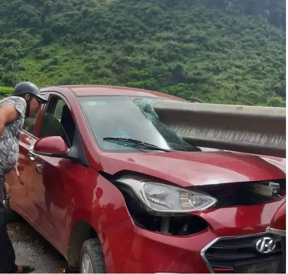 Tại hiện trường, thanh hộ lan bằng tôn đã đâm xuyên thủng kính lái vào trong khoang lái của xe ô tô nhãn hiệu Hyundai Grand i10 màu đỏ sát vị trí ghế lái nhưng may mắn không đâm trúng tài xế, tài xế không bị thương.