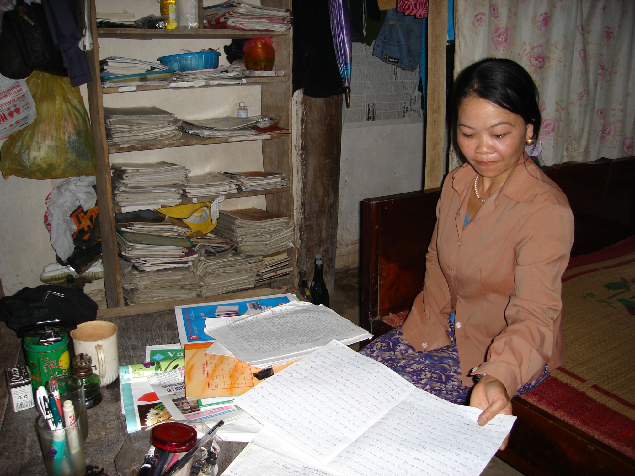Chị mặc, tập tễnh lê cái cơ thể tật nguyền cùng mớ tài liệu mà mấy người mủi lòng đã cho về nhà. Đốt đèn, đọc, nghiền ngẫm tìm cấu tứ chị bắt đầu dặt bút. Tưởng đơn giản, thế nhưng việc đánh vật với câu chữ, việc viết báo thật cũng không dễ. Cứ viết, không thấy ưng ý lại gạch, thậm chí là vò xé cả những trang bản thảo thế rồi hai bài viết đầu tay được chắt lọc từ mớ tài liệu xin được cũng hoàn thành. Cẩn thận chị chép lại rồi xin mẹ mấy nghìn bạc lẻ tập tễnh tìm tới bưu điện huyện. Phong bì được dán, địa chỉ gửi là Báo Hòa Bình chị trở về và mong đợi hy vọng.