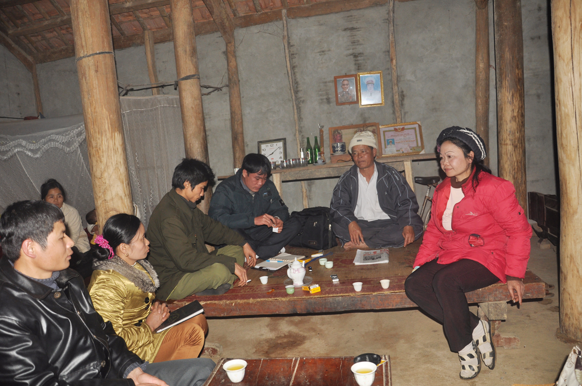 Chị Xa Lệ Thủy (người mặc áo đỏ) trong một lần đi tiếp xuce với dân để lấy số liệu cho bài điều tra ở xã miền núi Tân Minh (Yên Lương, Phú Thọ)