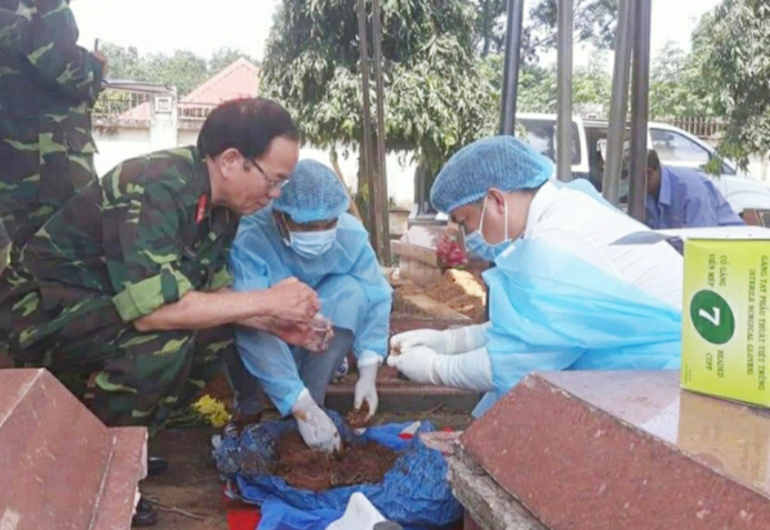 Đại tá Nguyễn Hùng Phong (ngoài cùng bên trái) cùng kỹ thuật viên pháp y lựa chọn mẫu sinh phẩm hài cốt để giám định ADN xác định danh tính liệt sĩ tại Nghĩa trang Long Khánh (tỉnh Đồng Nai).