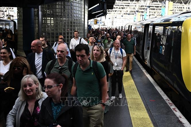 | Hành khách rời khỏi tàu tại nhà ga Waterloo ở thủ đô London, Anh, khi các công nhân tiến hành đình công kêu gọi tăng lương, ngày 21/6/2022. |
