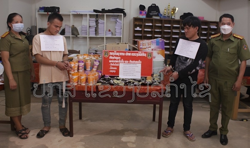 | Hai đối tượng cùng tang vật (ảnh Công an Bolikhamxay) |