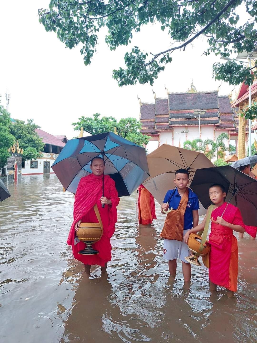 | Mưa làm ngập khuôn viên một ngôi chùa ở quận Sikhottabong của thủ đô Vientiane |