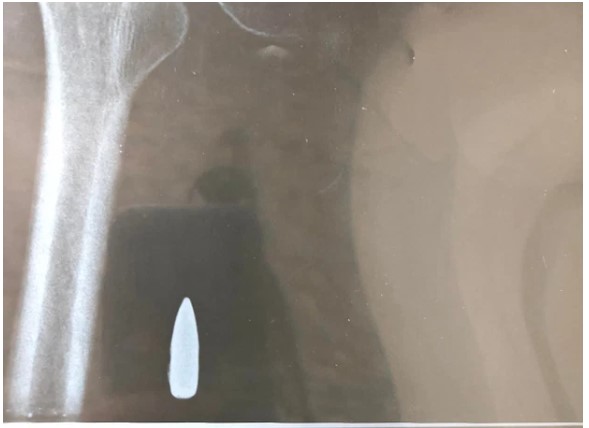 Hình ảnh X-quang đầu đạn trong đùi bệnh nhân.
