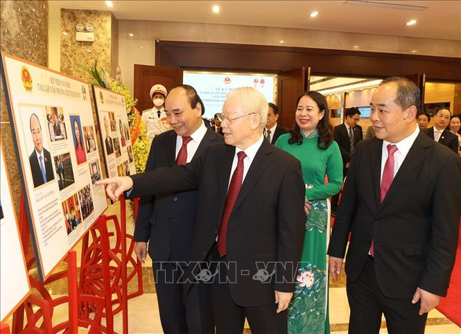 | Tổng Bí thư Nguyễn Phú Trọng, Chủ tịch nước Nguyễn Xuân Phúc xem một số hình ảnh trưng bày tại lễ kỷ niệm. |