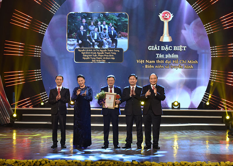Thủ tướng Nguyễn Xuân Phúc, Chủ tịch Quốc hội Nguyễn Thị Kim Ngân trao Giải Đặc biệt cho nhóm tác giả của Hãng phim Tài liệu và Điện ảnh Báo Nhân Dân với tác phẩm "Việt Nam thời đại Hồ Chí Minh - Biên niên sử truyền hình".