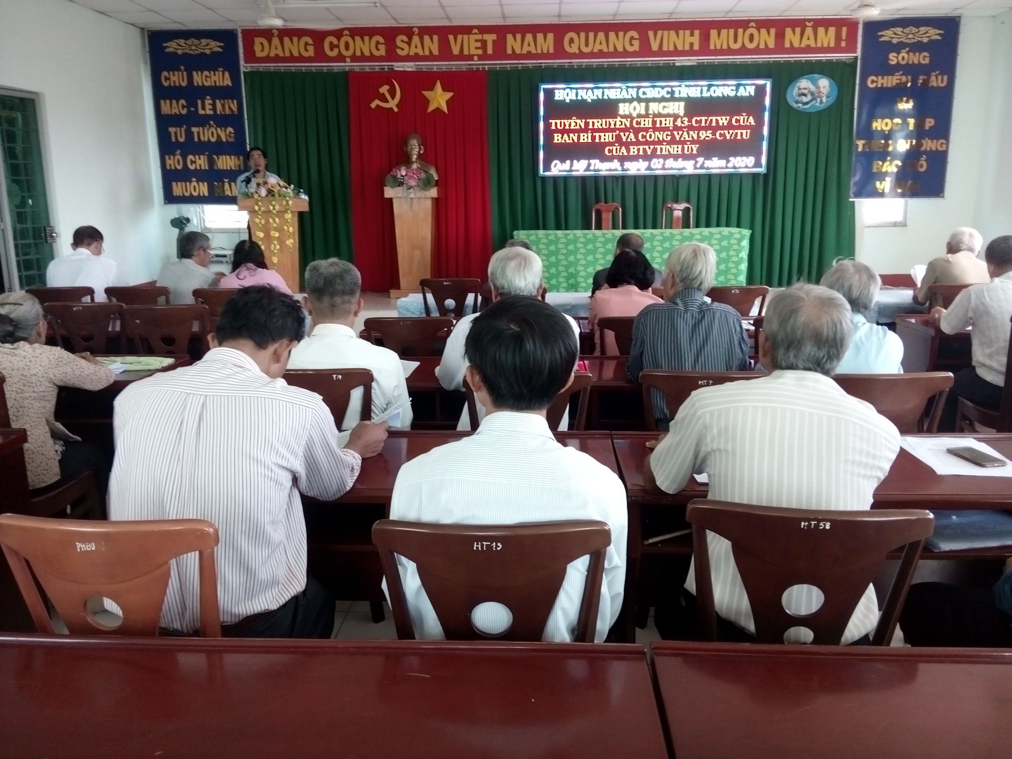 Sáng ngày 02/7/2020 tại xã Quê Mỹ Thạnh, huyện Tân Trụ. Hội NNCĐDC/dioxin tỉnh Long An tiếp tục tổ chức Hội nghị tuyên truyền Chỉ thị 43-CT/TW ngày 14/5/2015 của Ban Bí thư Trung ương Đảng khóa XI và Công văn số 95-CV/TU ngày 15/12/2015 của Ban Thường vụ Tỉnh ủy về “Tăng cường sự lãnh đạo của Đảng đối với công tác giải quyết hậu quả chất độc hóa học do Mỹ sử dụng trong chiến tranh ở Việt Nam”.