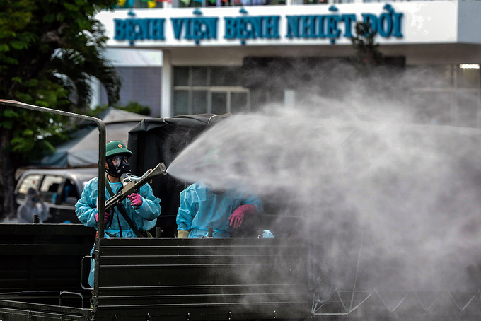 Xe đặc chủng phun khử khuẩn Bệnh viện Bệnh Nhiệt đới chiều 13/6. Ảnh: Hữu Khoa.