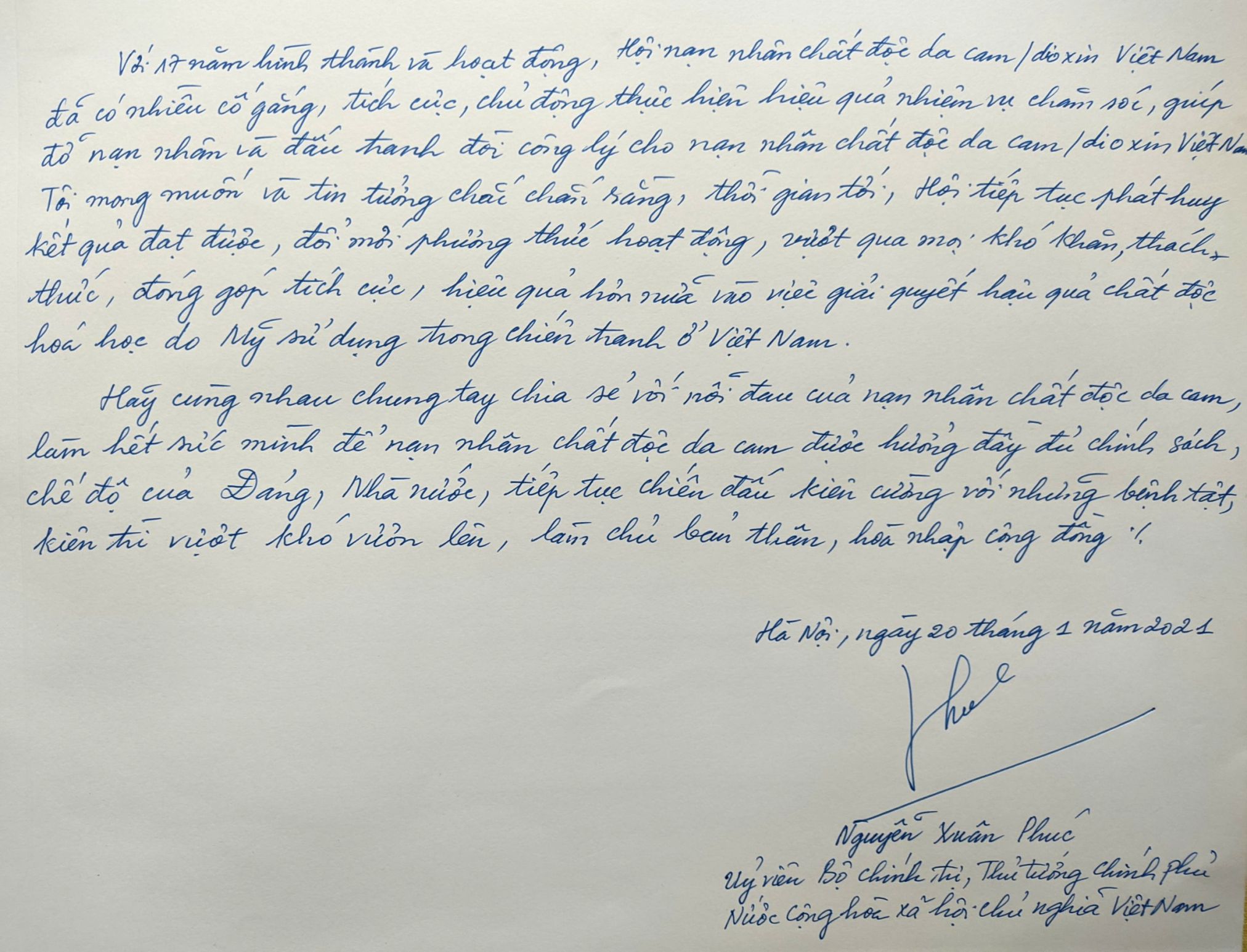 Ngày 20 tháng 11 năm 2021, Đồng chí Nguyễn Xuân Phúc Ủy viên Bộ Chính trị, Thủ tướng Chính phủ Nước Cộng hòa cộng hòa xã hội chủ nghĩa Việt Nam đã đến thăm và làm việc với Hội Nạn nhân chất độc da cam/dioxin Việt Nam. Sau buổi làm việc, Thủ tướng đã ghi lưu bút trong Sổ vàng truyền thống của Hội. Tạp chí Da cam Việt Nam trân trọng gửi đến bạn đọc toàn văn lưu bút của Thủ tướng.