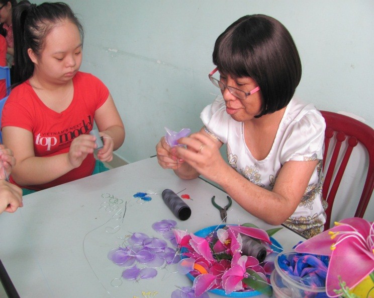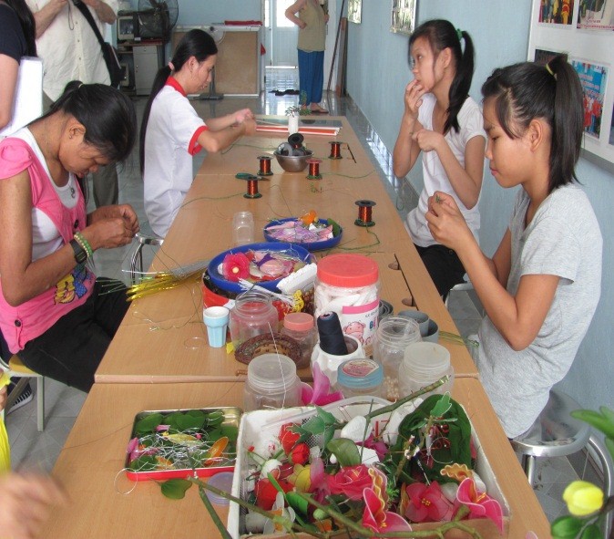 Các Cô đang hướng dẫn các em nạn nhân da cam học may và làm hương